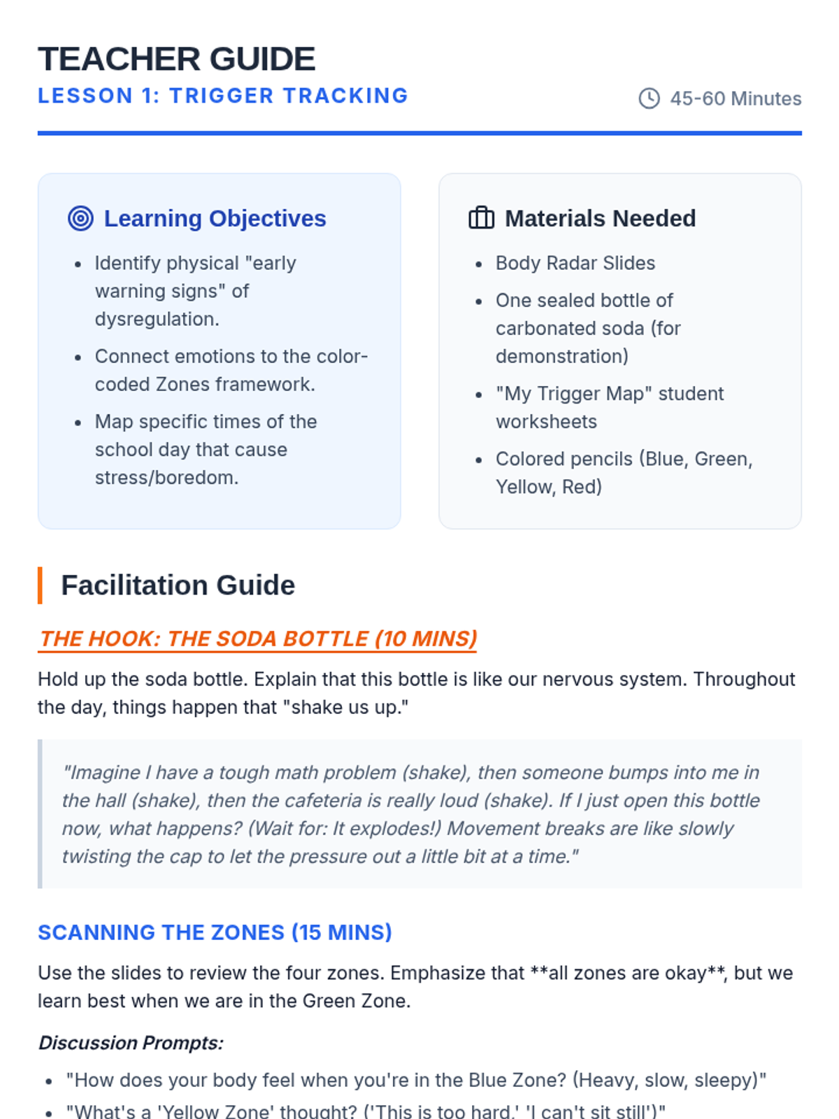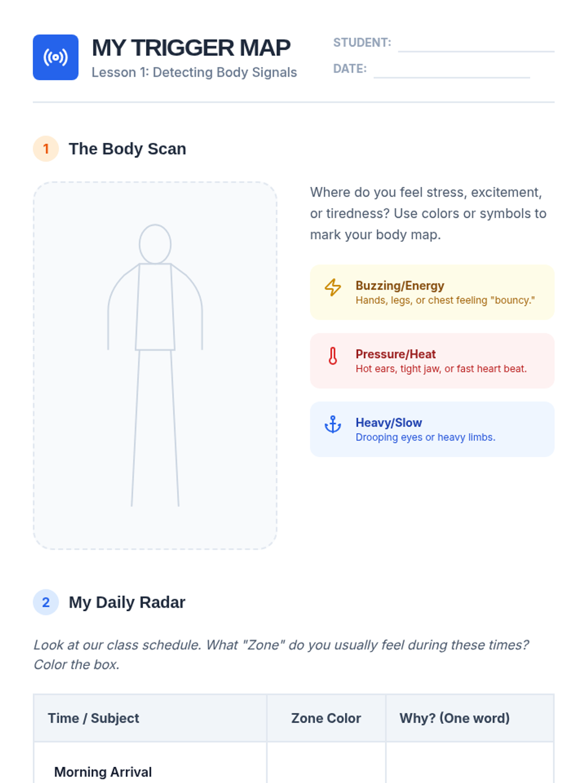 This inquiry-based sequence helps students identify the physiological and environmental precursors to behavioral outbursts. Students learn to recognize their body's 'rumble' signals, identify personal triggers, understand the brain's role in emotional regulation, and create a personalized early warning system for self-regulation.