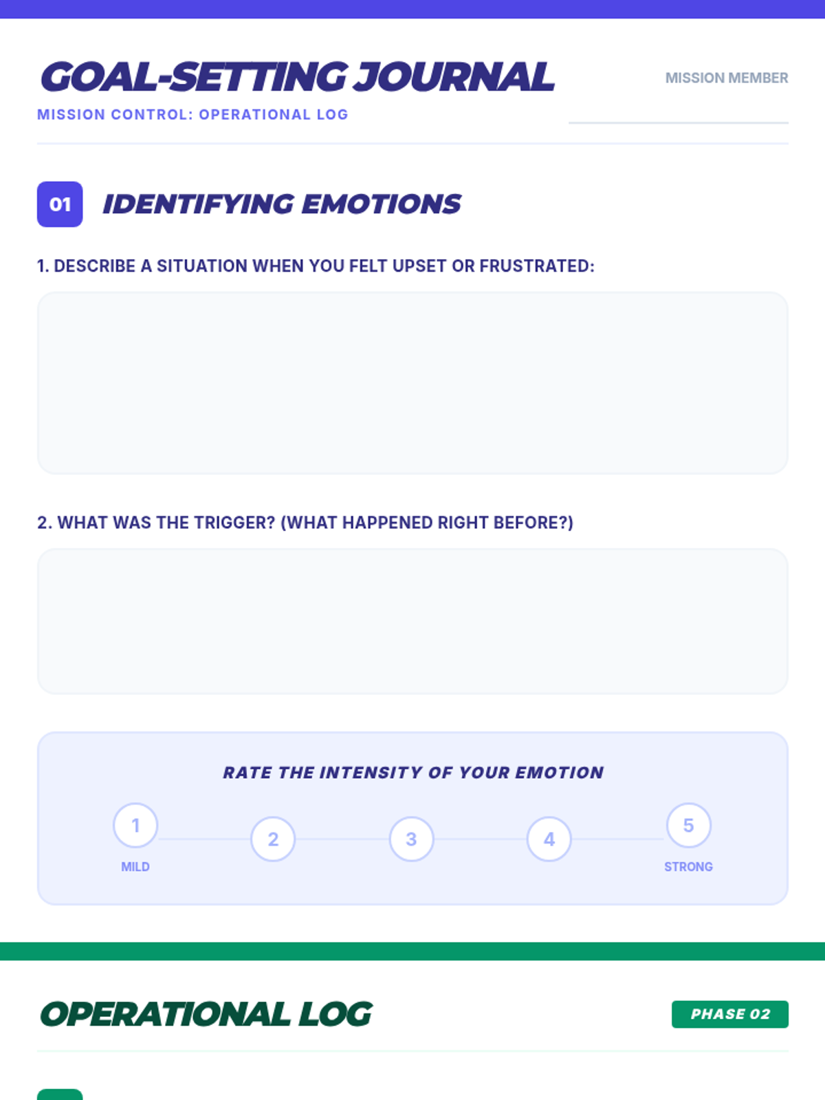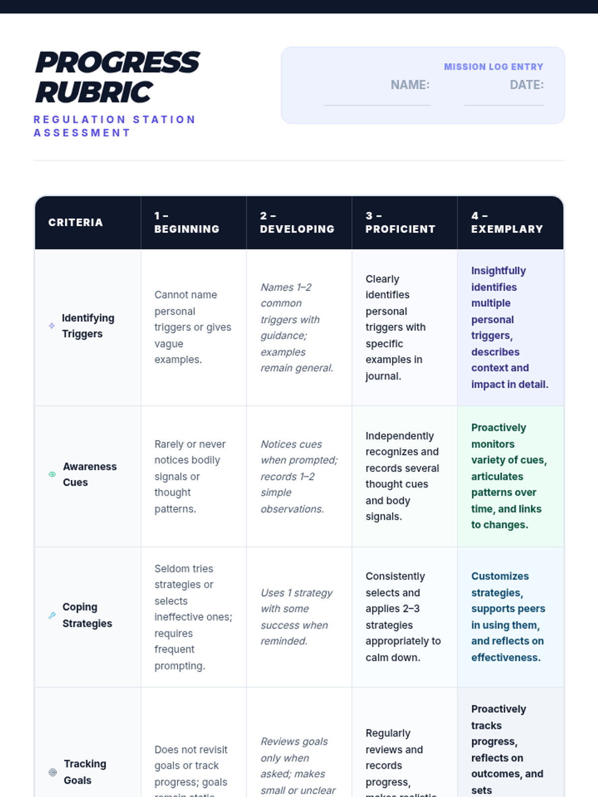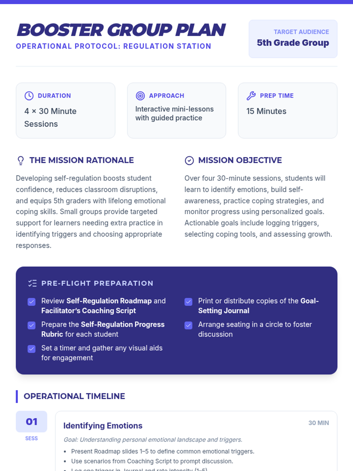 A 4-session Tier 2 small group sequence for 5th graders to develop self-regulation, emotional awareness, and coping strategies. Students identify triggers, set personal goals, and monitor progress using a specialized journal and rubric.