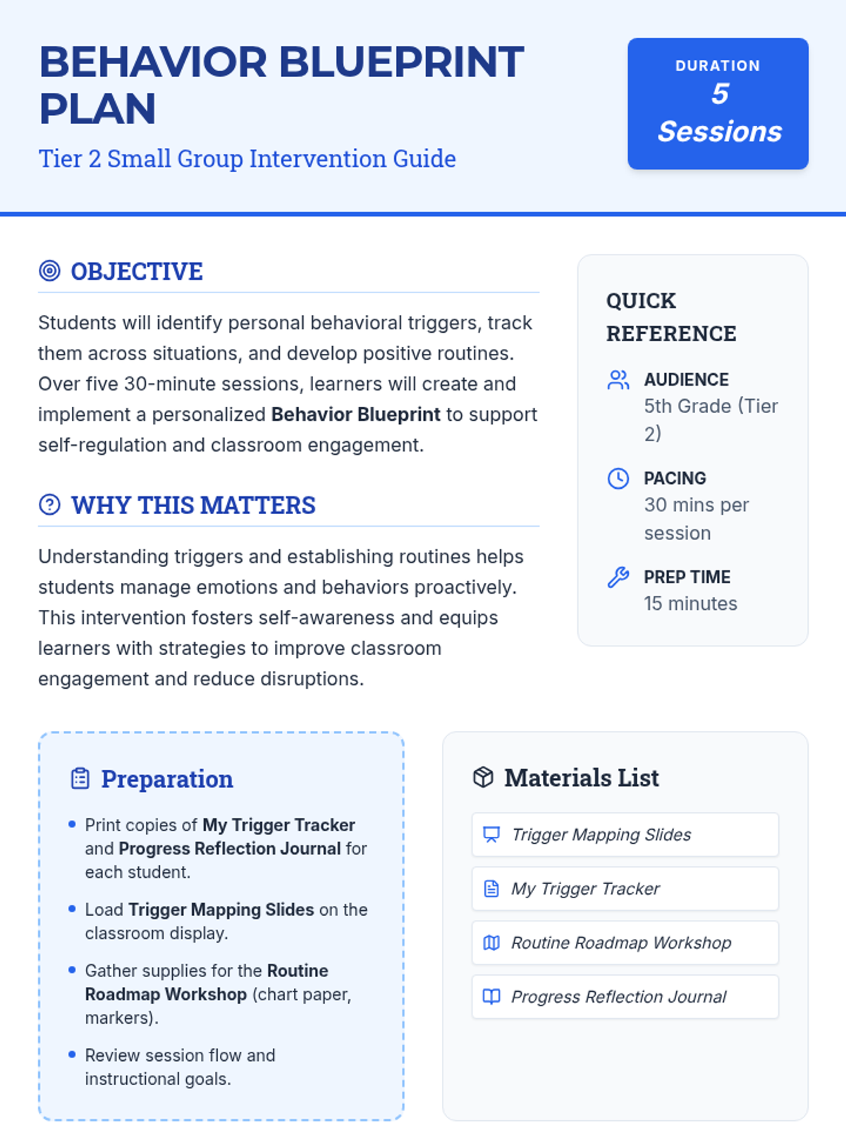 A 6-session Tier 2 small group intervention for 5th graders designed to build self-awareness, identify behavioral triggers, understand consequences, and develop personal action plans for positive behavior.