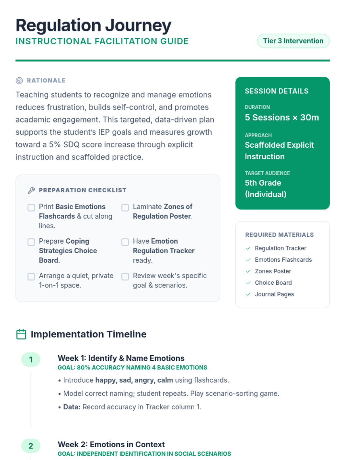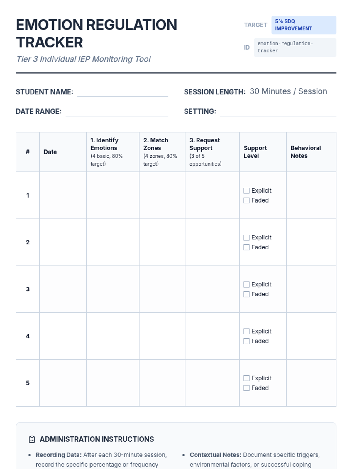 A comprehensive Tier 3 intervention sequence focused on emotional regulation for 5th-grade students. This program tracks progress across identifying emotions, matching zones, and utilizing coping strategies.