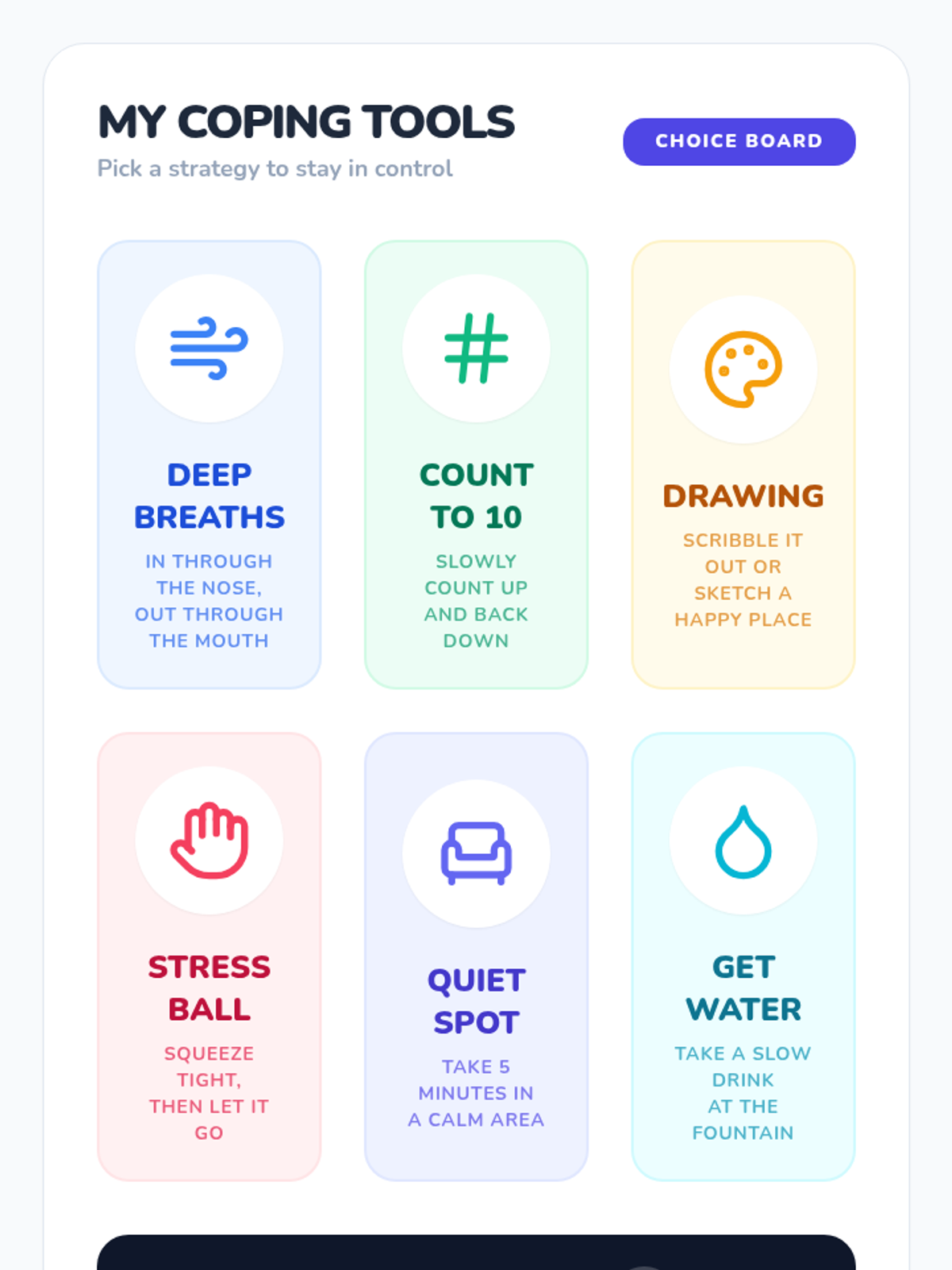 An 8-session Tier 3 intervention sequence designed to help individual students develop a 'toolbox' of self-regulation strategies. Students progress from identifying emotions to mastering specific physical, mental, and behavioral tools to handle challenging classroom situations.