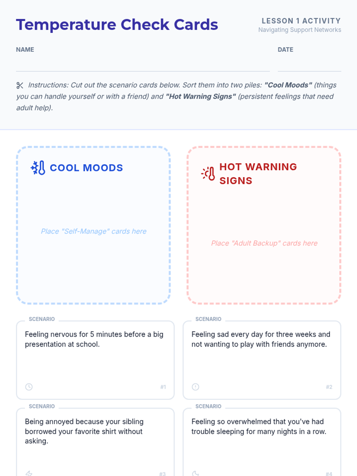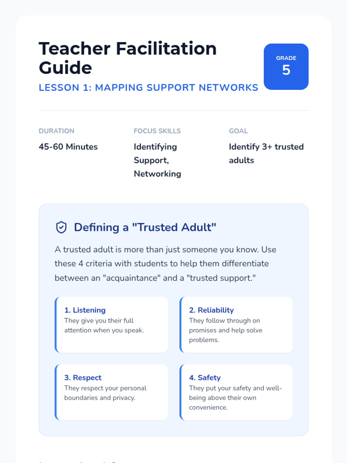 This sequence helps 5th-grade students build a personal support system by identifying trusted adults, understanding the school counselor's role, and learning how to articulate a need for help. Through interactive mapping and role-play, students gain the confidence and tools to access mental health resources.