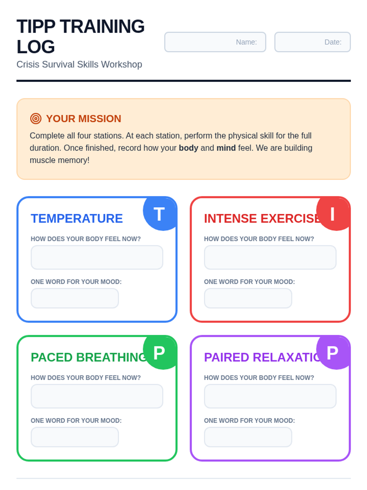 A gamified, mastery-based sequence designed to build automaticity with TIPP crisis survival skills. Students move through a 'Boot Camp' style curriculum, mastering Temperature, Intense Exercise, Paced Breathing, and Paired Muscle Relaxation through rapid-fire drills and simulations.