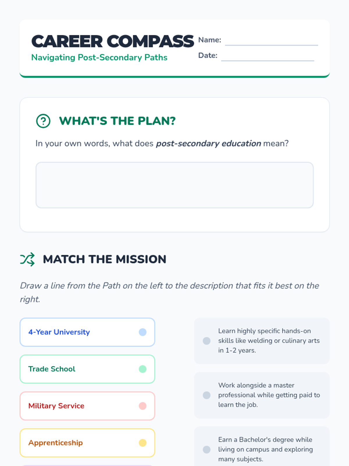 A comprehensive career exploration unit for 5th graders that demystifies post-secondary options, including college, trades, military, and apprenticeships, through a 'journey' themed lens.