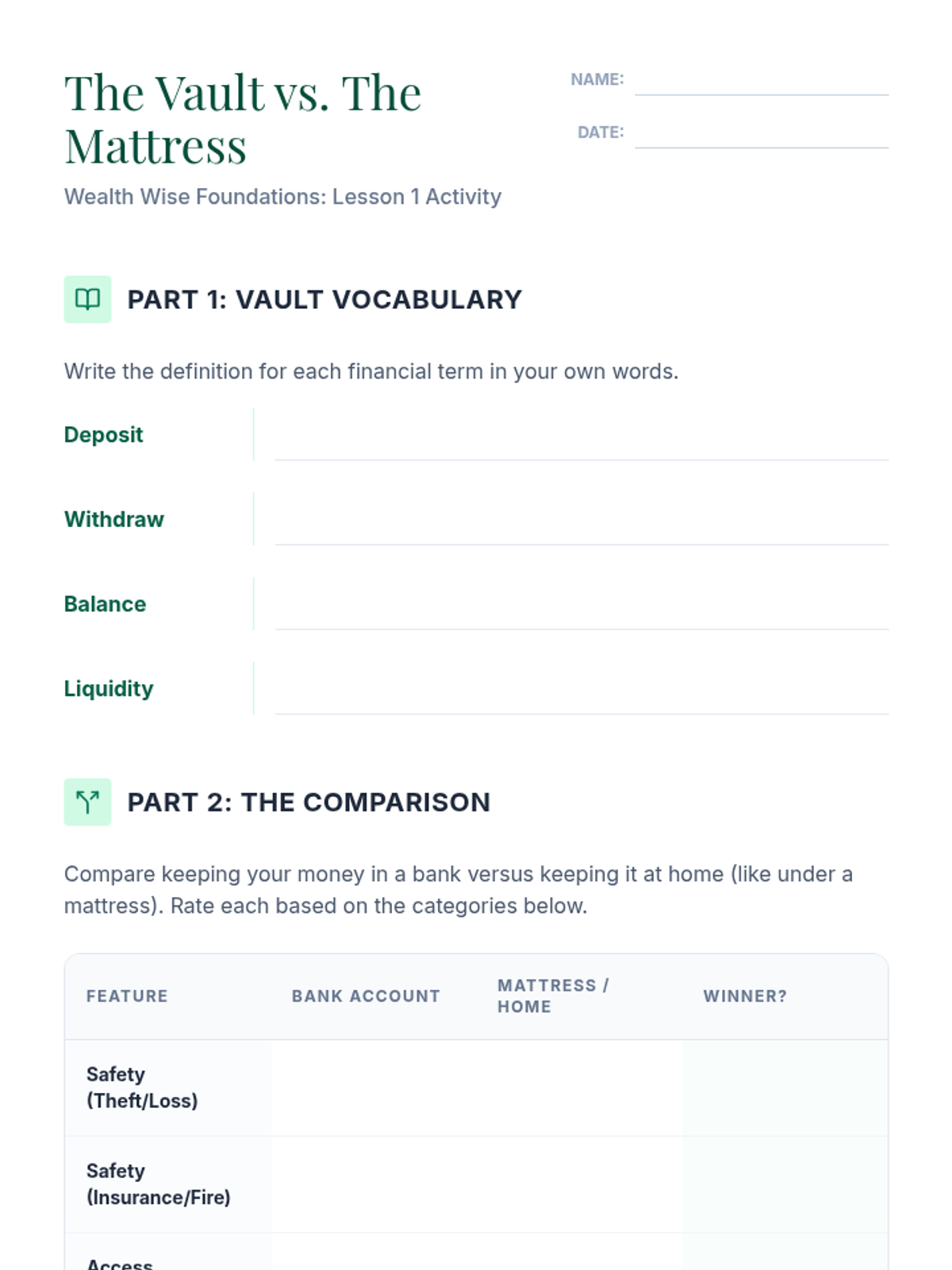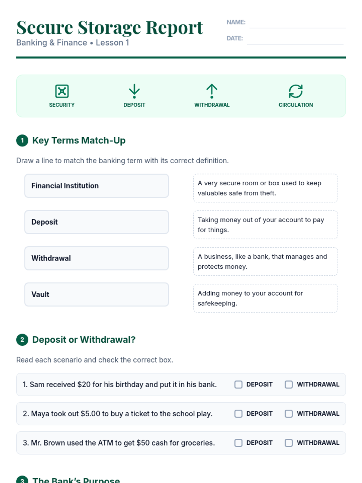 A comprehensive 5th-grade unit on the mechanics of retail banking, focusing on the difference between account types, the mathematical calculation of simple and compound interest, and the importance of financial security. Students engage in simulations to understand how banks protect and grow money.