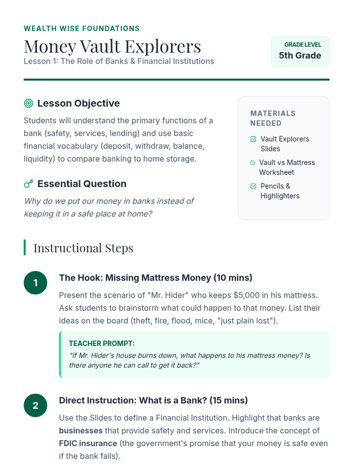 This sequence introduces 5th-grade students to banking fundamentals, focusing on the security of financial institutions, the mechanics of simple interest, the difference between account types, and personal financial planning. Students participate in a classroom economy simulation to practice real-world skills like ledger balancing and interest calculation.