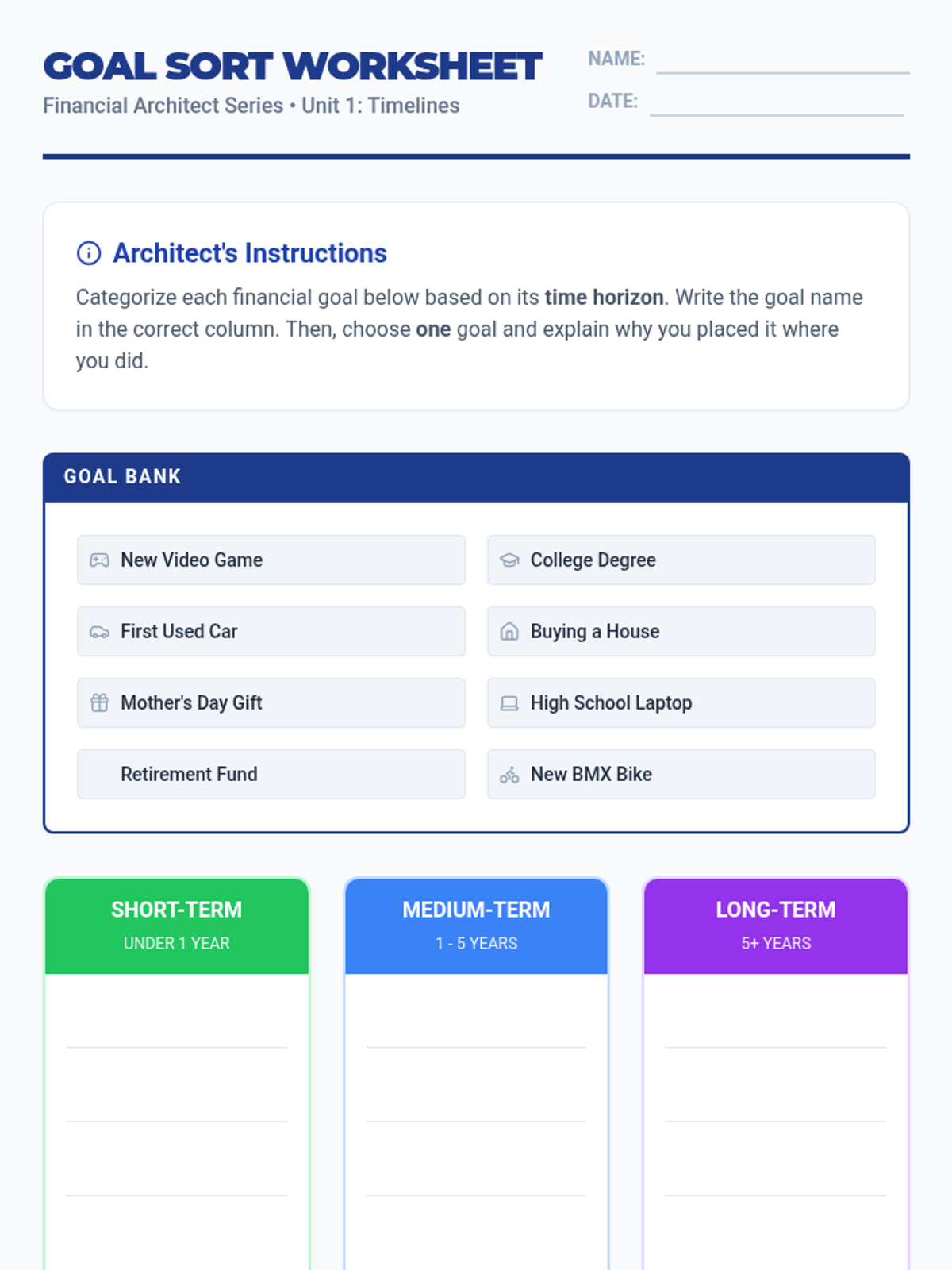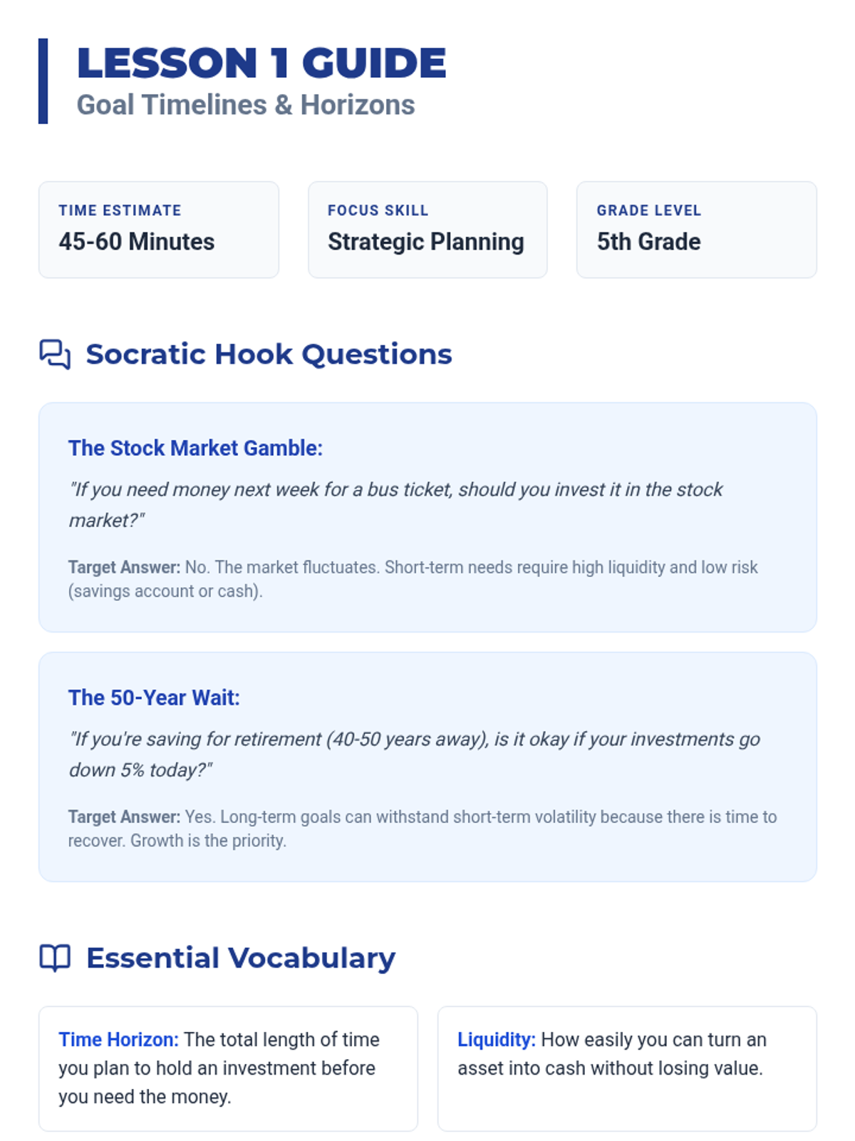 A comprehensive 5th-grade financial literacy sequence where students learn to categorize goals, match them with financial tools, understand inflation, and draft a 20-year wealth management roadmap.