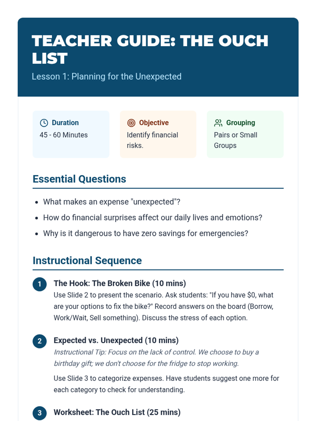 This sequence teaches 5th-grade students about the importance of emergency funds and liquidity. Through brainstorming, simulations, and financial modeling, students learn how to protect themselves from unexpected expenses before pursuing long-term investments.
