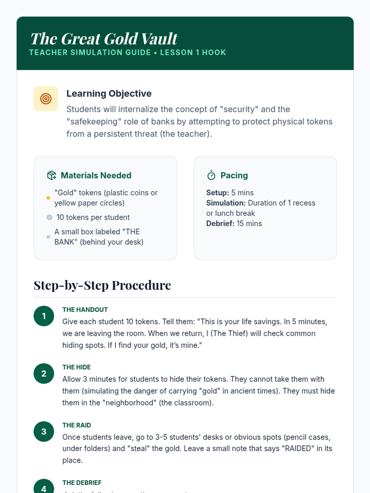 A 5th-grade financial literacy sequence that teaches students the power of saving, the mechanics of interest, and the exponential growth of compound interest through hands-on simulations and mathematical reasoning.