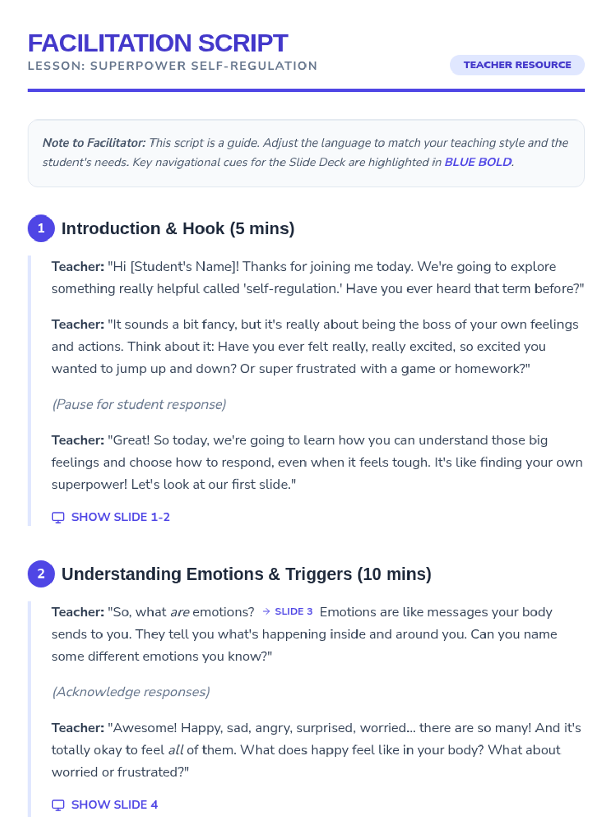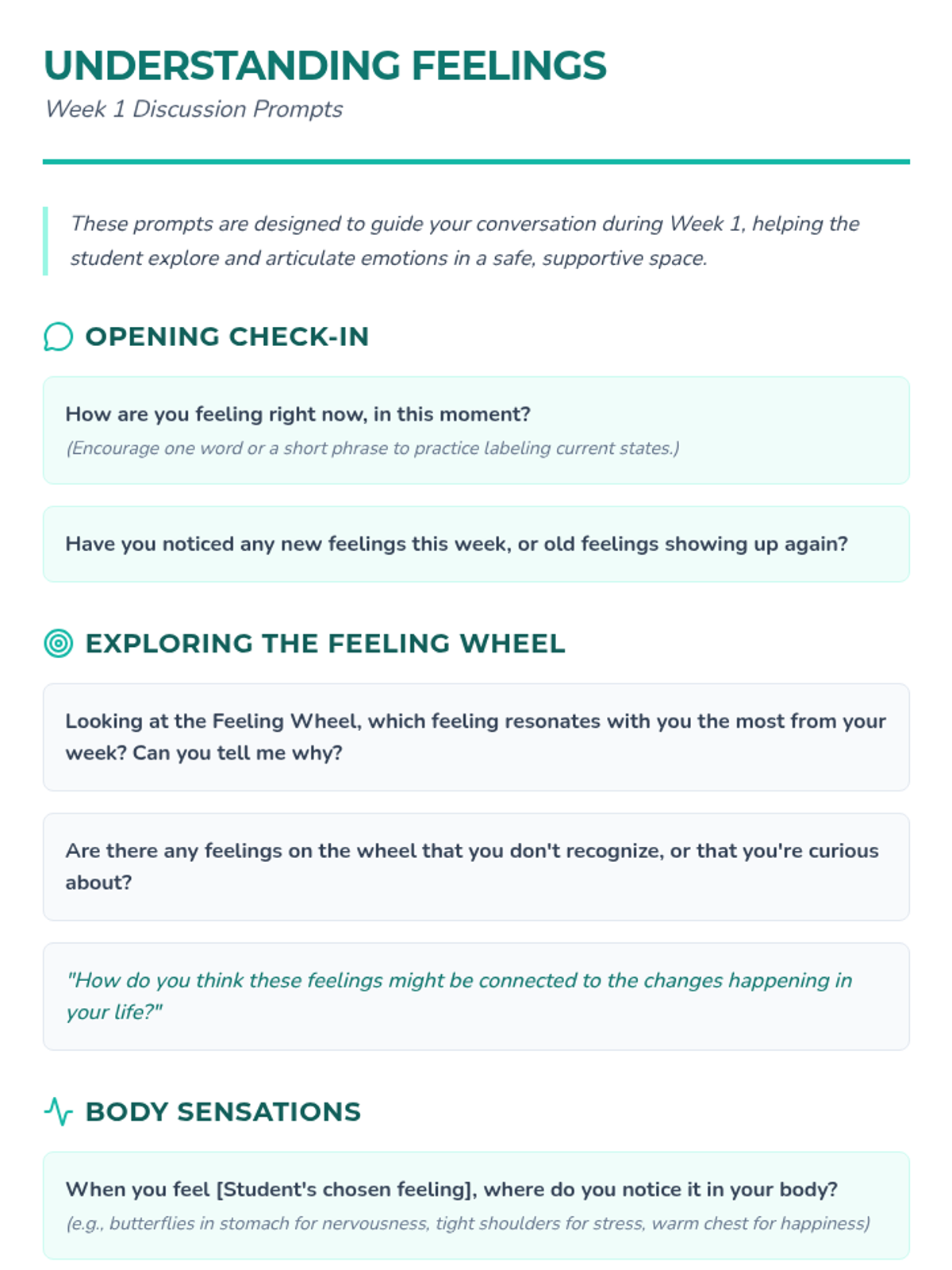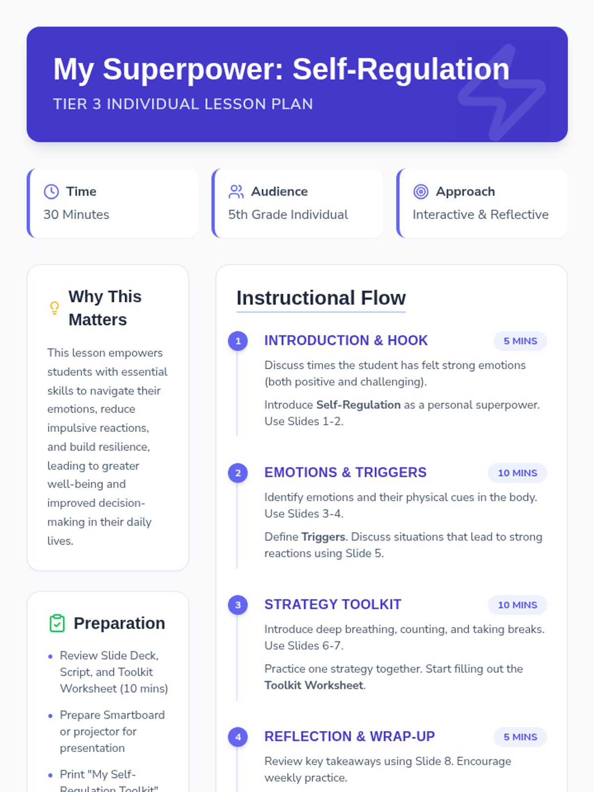 An 8-week social-emotional learning curriculum designed for 20-minute sessions. Students learn to identify, categorize, and apply coping skills through a blueprint-inspired framework of self-regulation.