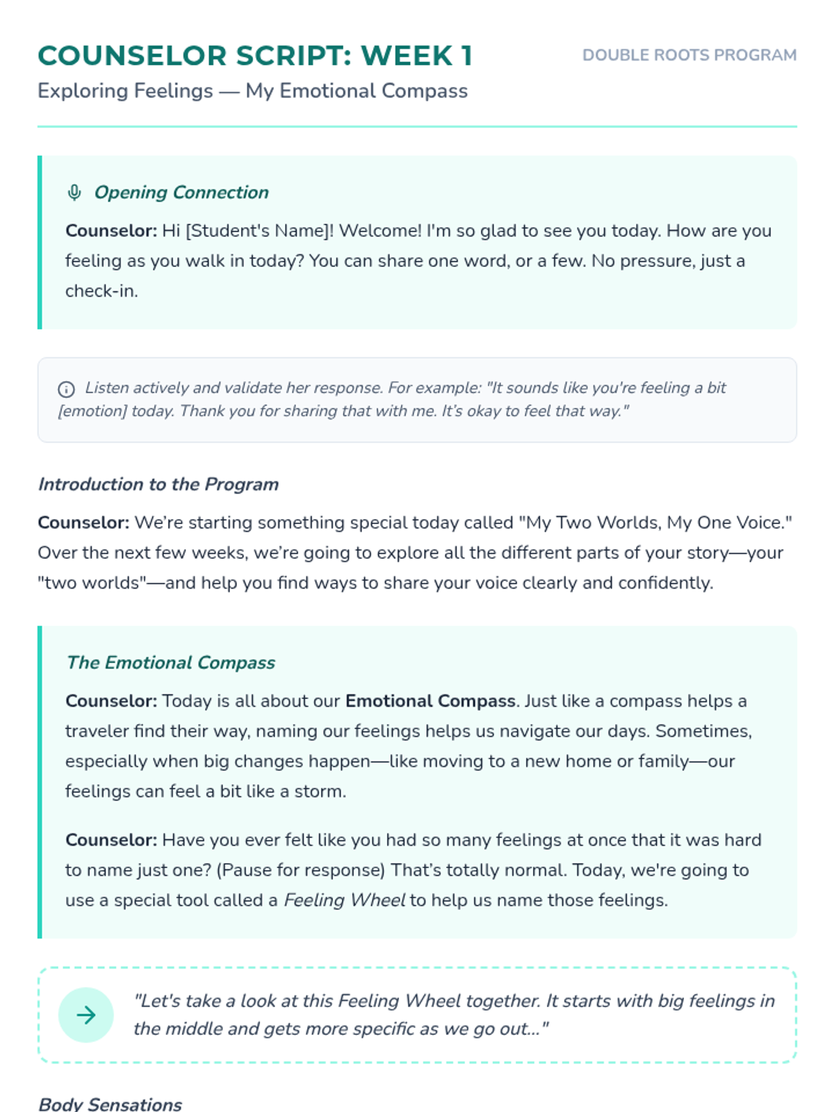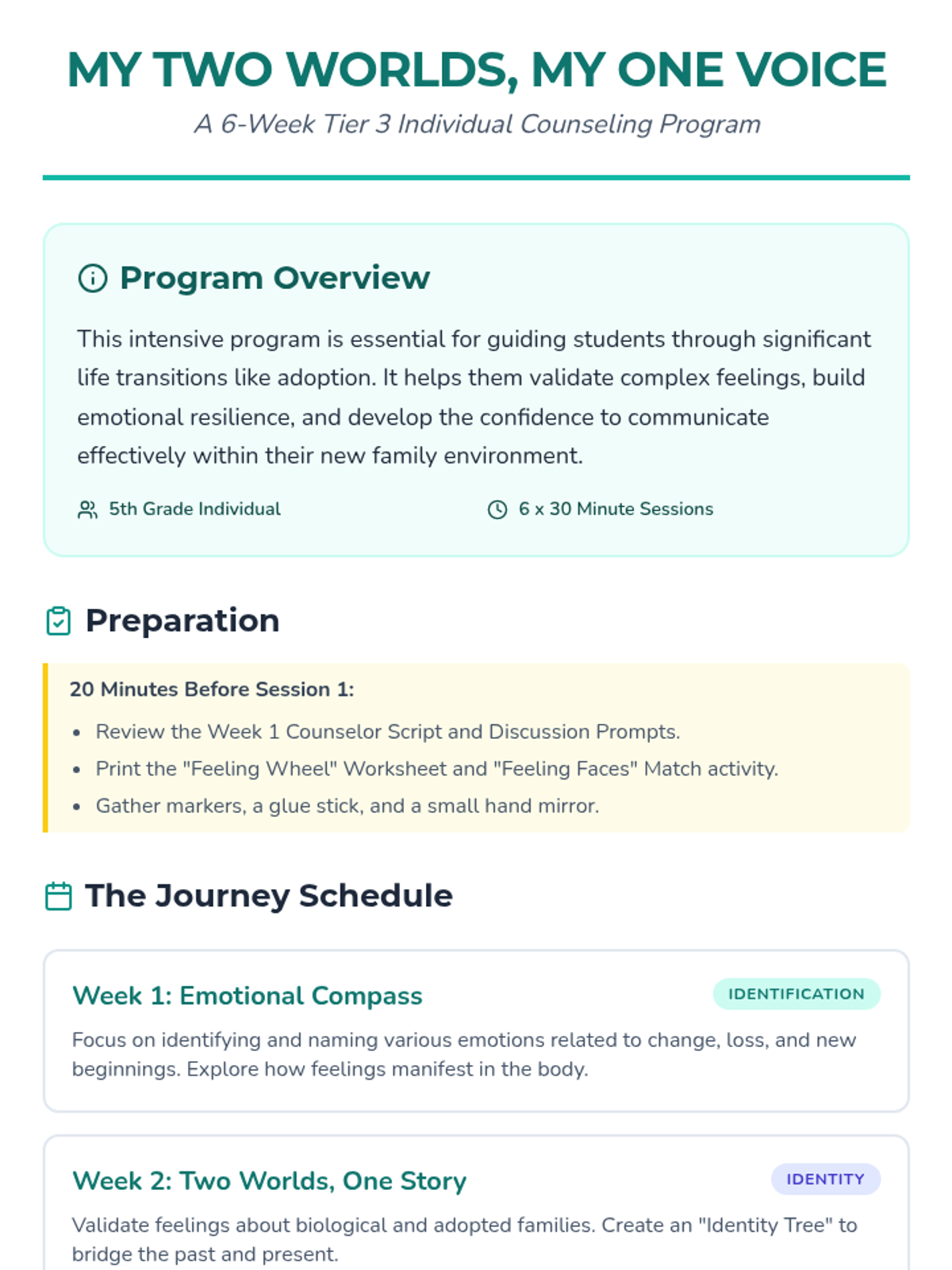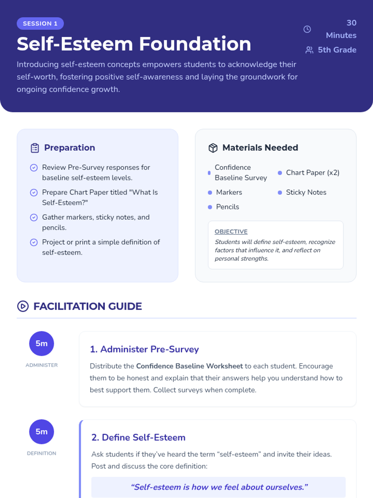An 8-week social-emotional learning curriculum designed for 20-minute sessions. Students learn to identify, categorize, and apply coping skills through a blueprint-inspired framework of self-regulation.
