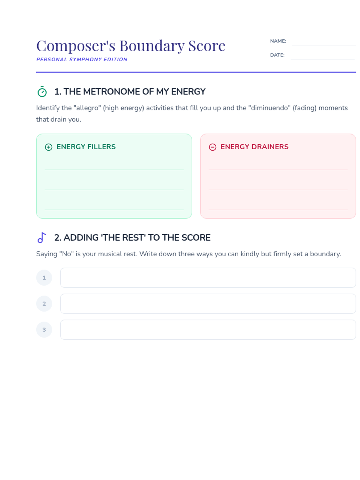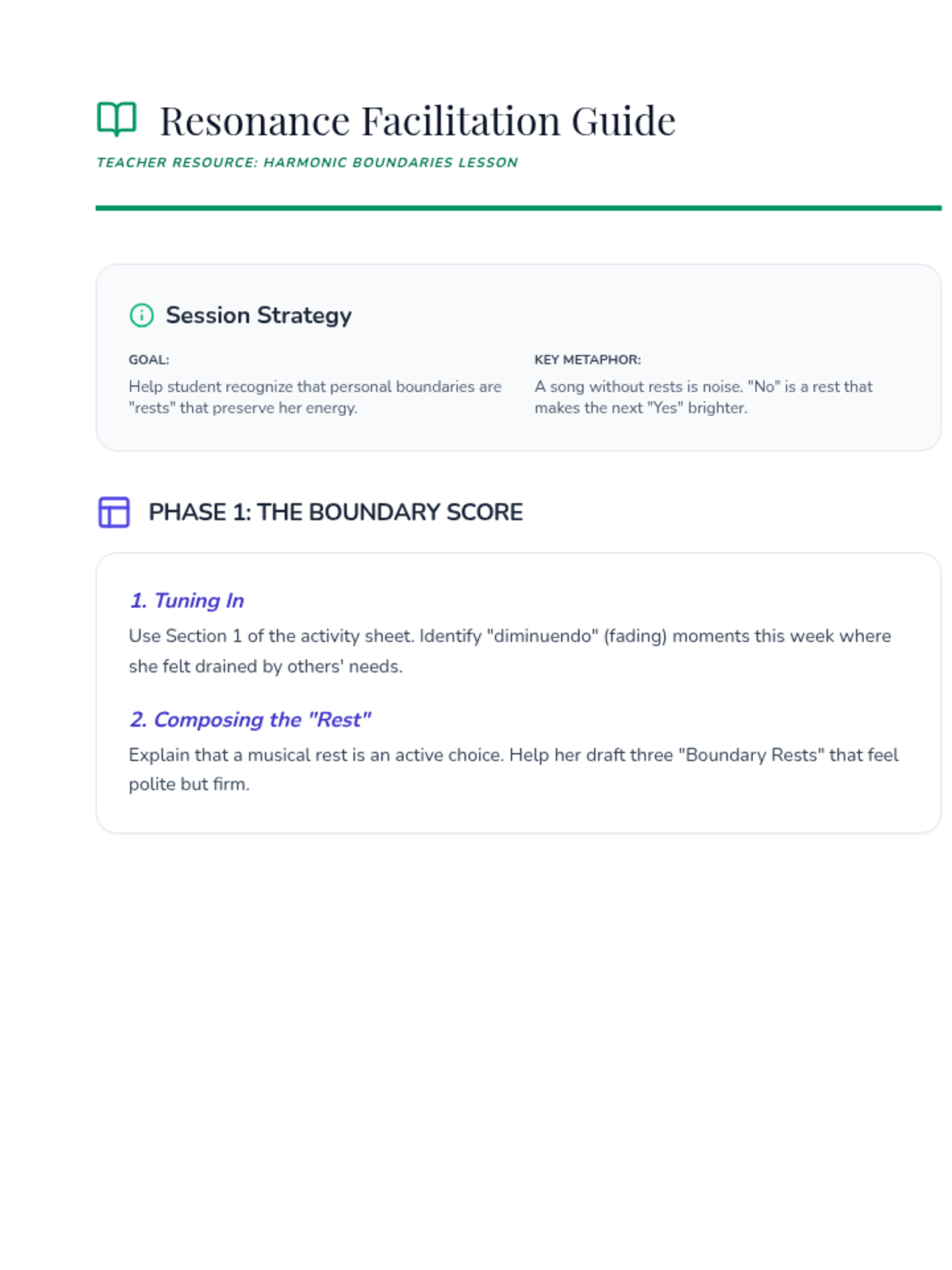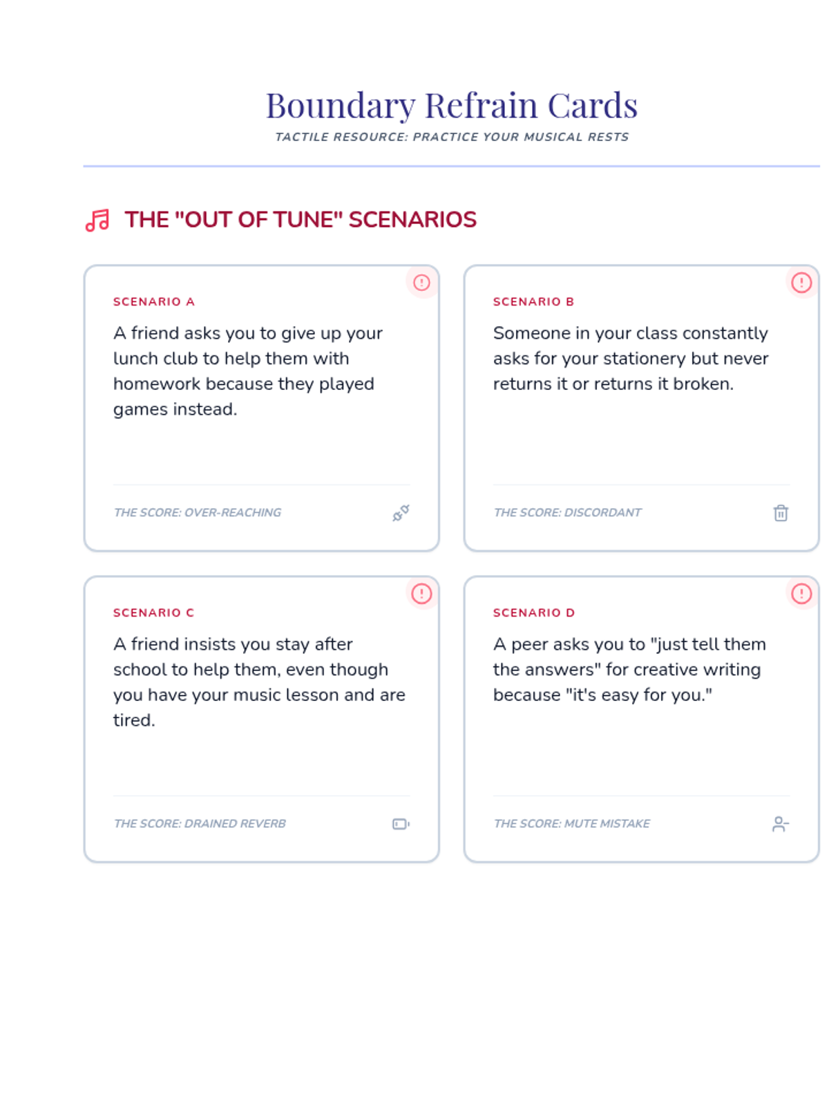 A sequence focused on helping students balance their natural kindness with healthy boundaries, using musical and creative writing metaphors to explore self-preservation and the power of 'no'.