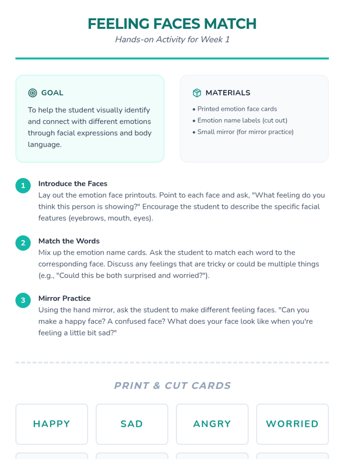 Counseling & Life SkillsSelf-AwarenessBasic Emotion RecognitionComplex Emotion IdentificationEmotional Nuance & Mixed FeelingsBuilding Positive Self-ImageRecognizing Strengths & Growth AreasAccurate Self-AssessmentPersonal Values IdentificationCultural & Individual Identity ExplorationValues-Based Decision MakingSelf-ManagementStop-and-Think StrategiesDelaying GratificationIndependent Impulse ManagementIdentifying Stress TriggersShort-Term Goal SettingSMART Goals DevelopmentGoal Monitoring & AdjustmentBuilding Perseverance & ResilienceInternal Motivation DevelopmentComprehensive Stress Reduction PlanningSocial AwarenessRecognizing Others' FeelingsDemonstrating EmpathyRespecting Individual DifferencesUnderstanding Cultural DiversityComplex Empathetic ResponsesMultiple Viewpoint ConsiderationMulti-Perspective AnalysisChallenging Stereotypes & BiasRelationship SkillsActive ListeningClear Verbal & Nonverbal CommunicationBuilding Positive FriendshipsWorking Cooperatively in GroupsCommunicating Personal BoundariesRespecting Others' BoundariesAssertive ExpressionPeaceful Problem-SolvingContributing to Team GoalsComplex Conflict NavigationMediation & NegotiationHealthy Romantic RelationshipsResponsible Decision-MakingDaily Problem IdentificationBrainstorming Multiple SolutionsEvaluating Pros & ConsRecognizing Risks & ConsequencesApplying Ethical FrameworksInformed Risk-Benefit DecisionsRoot Cause AnalysisMindfulnessMindful BreathingBody Scan MeditationDaily Mindfulness ApplicationDaily Self-Care RoutinesBalancing Life DemandsAdvocating for Wellness NeedsMental Health SupportUnderstanding Anxiety SymptomsWorry Management StrategiesProgressive Muscle RelaxationRecognizing Depression SignsBuilding Mood-Supporting RoutinesBehavioral Activation for MoodUnderstanding Grief StagesHealthy Grief CopingCreative Expression of LossBehavioral SupportDaily Check-In ProceduresDaily Goal Setting & ReviewRecognizing Escalation Warning SignsRequesting Breaks & SupportSelf-Calming During DistressUnderstanding Positive ReinforcementToken Economy ImplementationBehavior Chart TrackingAnalyzing Behavior PatternsIdentifying Antecedents & ConsequencesDetermining Behavior FunctionFunction-Based InterventionsIndividualized Behavior ContractsData-Driven Behavior AdjustmentTherapeutic ApproachesThoughts-Feelings-Behaviors ConnectionRecognizing Thinking PatternsChallenging Negative ThoughtsPositive Self-Talk PracticeThought Record TrackingAdvanced Cognitive RestructuringComprehensive CBT PlansBehavioral Activation TechniquesBuilding Positive ExperiencesExposure Hierarchies for AnxietyPresent-Moment AwarenessNon-Judgmental ObservationSelf-Soothing & DistractionComplex Emotion LabelingReducing Emotional Vulnerability (PLEASE)DEAR MAN CommunicationGIVE Skills for RelationshipsFAST Skills for Self-RespectRadical Acceptance PracticeCrisis Survival Skills (TIPP)Understanding Trauma EffectsTrauma Responses & TriggersIdentifying Trauma FeelingsGrounding TechniquesRegulation During Trauma DistressSafe Place VisualizationProcessing Through NarrativeDeveloping Trauma StoryPersonalized Safety PlanningGroup SupportTurn-Taking & SharingGroup Conversation SkillsSharing in Supportive EnvironmentLearning from Similar ChallengesBuilding Community & BelongingNavigating Peer RelationshipsGroup Skill PracticeGroup Mental Health EducationStress & Anxiety UnderstandingCrisis Support & SafetyKnowing When to Seek HelpIdentifying Mental Health CrisesGrounding During CrisisUsing Crisis HotlinesBuilding Support NetworksAccessing Mental Health ResourcesWarning Signs & Coping StrategiesDeveloping Personal Safety PlansUnderstanding Suicide Warning SignsGatekeeper Skills for PeersDigital LiteracySocial MediaTechnology BasicsProductivity ToolsInternet and Online ResearchWeb Design and PublishingDigital CitizenshipOnline Safety and PrivacyEmerging TechnologiesFinancial LiteracyMaking Financial DecisionsBanking and AccountsConsumer SkillsSaving and InvestingCredit and DebtEmployment and IncomeTaxesInsuranceMajor PurchasesEconomic ConceptsFinancial PlanningCollege & Post-Secondary PlanningCareer ExplorationUnderstanding Post-Secondary OptionsCollege Research & SelectionAdmission RequirementsCollege Application ProcessPersonal Statement WritingFAFSA CompletionScholarship Search & ApplicationsUnderstanding Student LoansContinuing Education PlanningInterview PreparationResearching EmployersCommon Interview QuestionsSTAR Method ResponsesProfessional Interview PresenceVirtual Interview SkillsInterview Follow-UpJob Search SkillsUnderstanding Job PostingsEffective Job Search StrategiesNetworking for OpportunitiesResume Writing BasicsAction Verbs & AchievementsTailoring Resumes to JobsCover Letter WritingProfessional ReferencesProfessional CommunicationBusiness Email EtiquettePhone & Voicemail ProfessionalismMeeting ParticipationPresentation SkillsProfessional Work EthicTime Management & ProductivityTeamwork & CollaborationAdaptability & FlexibilityProblem-Solving at WorkConstructive FeedbackWorkplace RightsUnderstanding Employment LawsPay & Benefits UnderstandingWorkplace SafetyAnti-Discrimination & Harassment