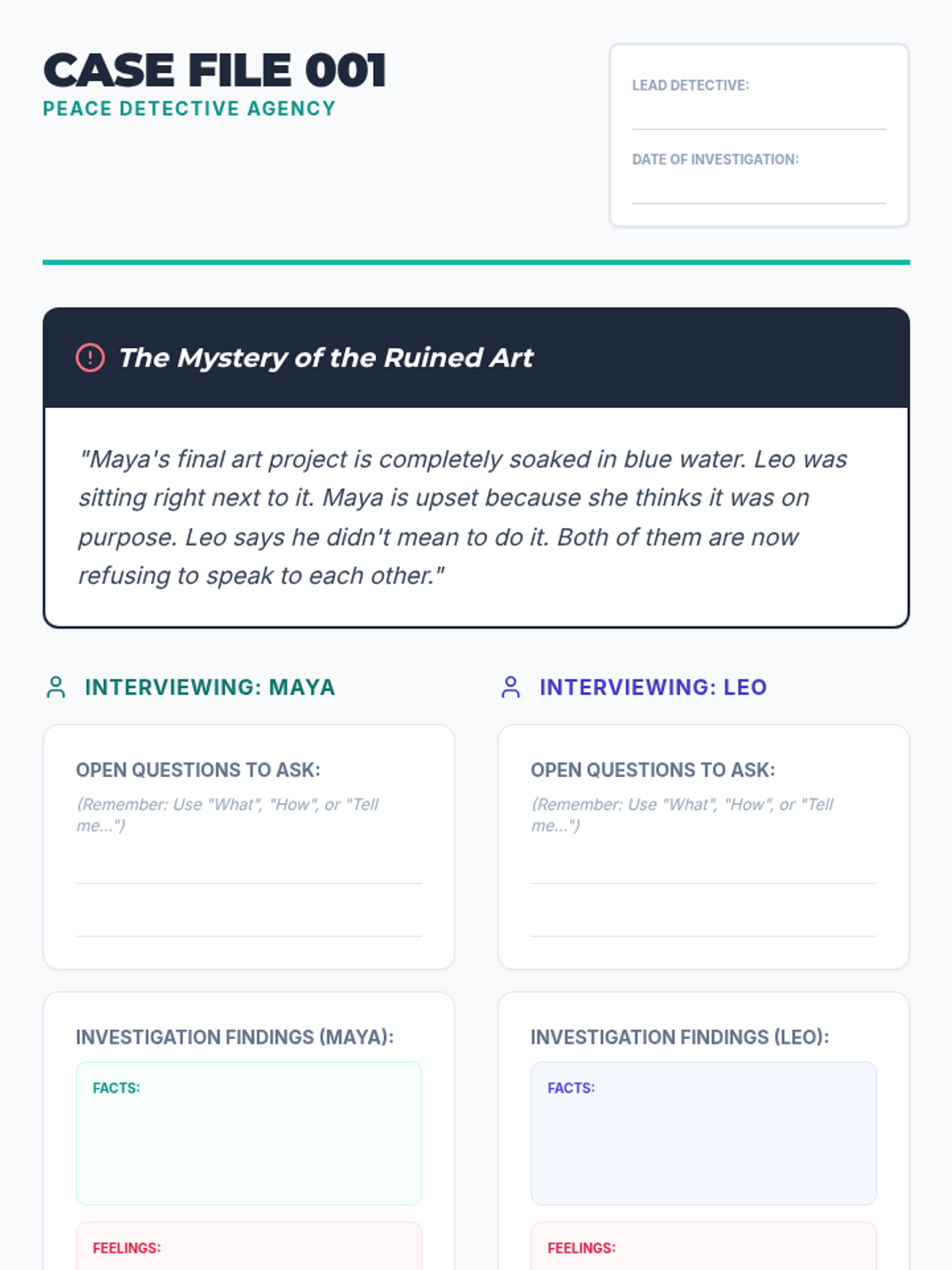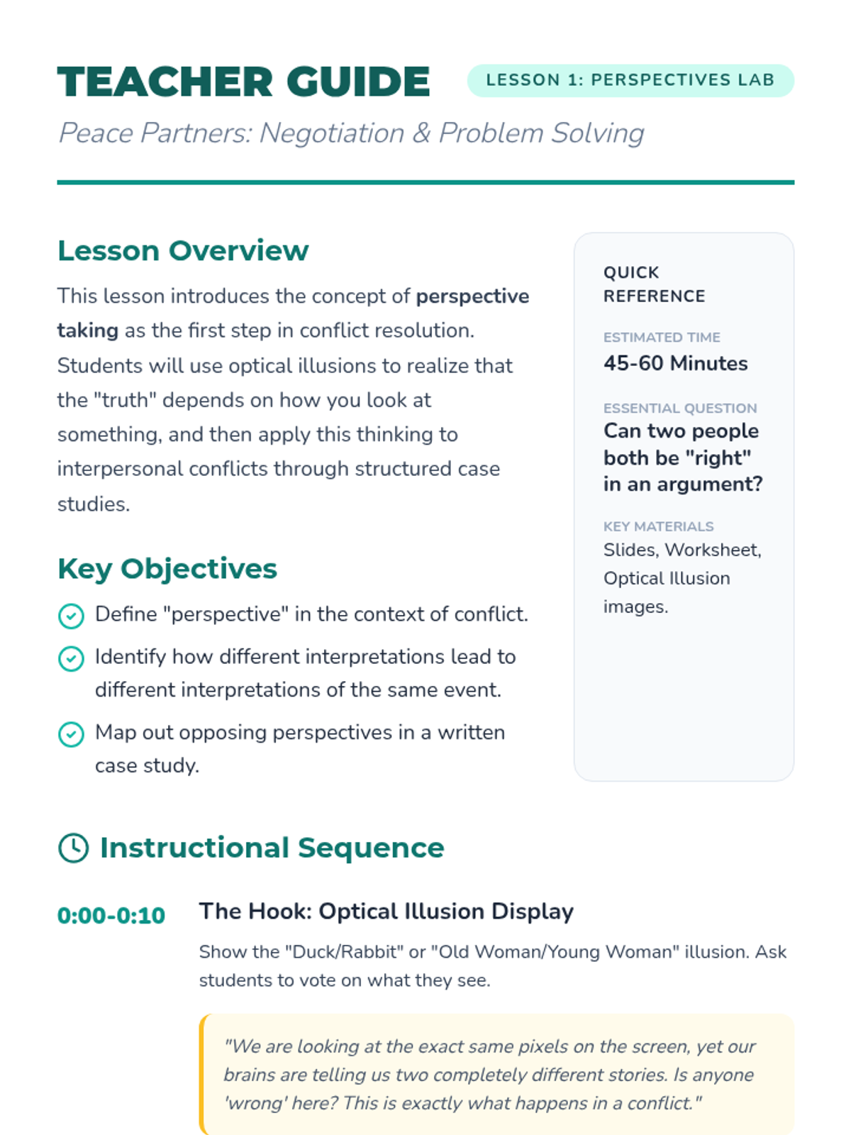 This sequence empowers students to act as third-party neutrals, introducing the specific structure and skills of Peer Mediation. Students learn the distinct phases of a mediation session, the importance of neutrality, and how to facilitate dialogue without taking sides.