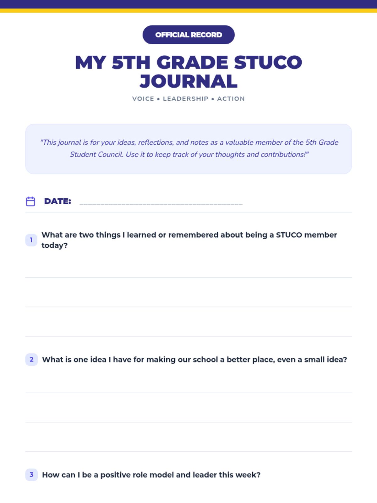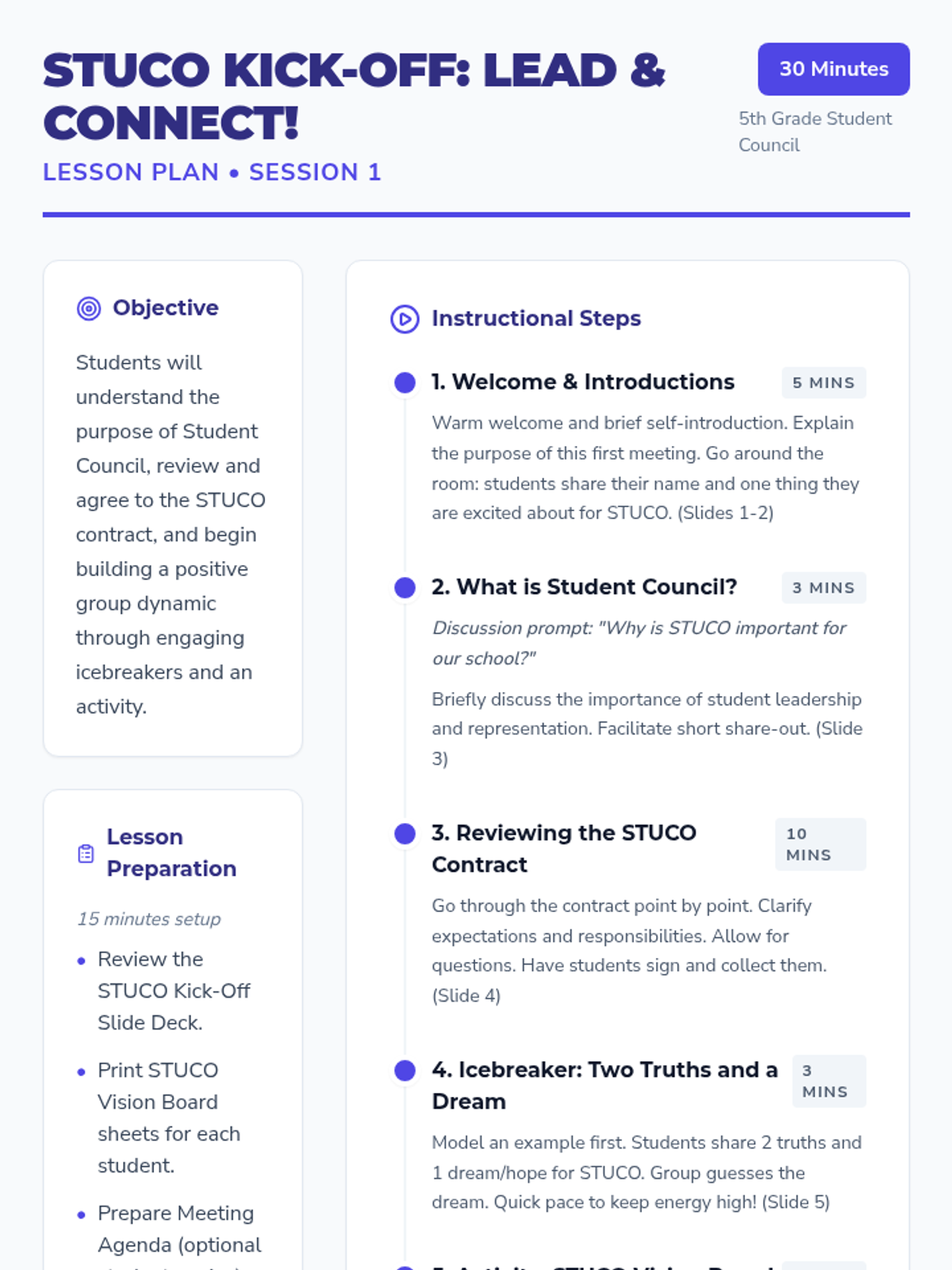 A two-part sequence for 5th-grade Student Council members, focusing on leadership foundations, community building, and collaborative school improvement brainstorming.