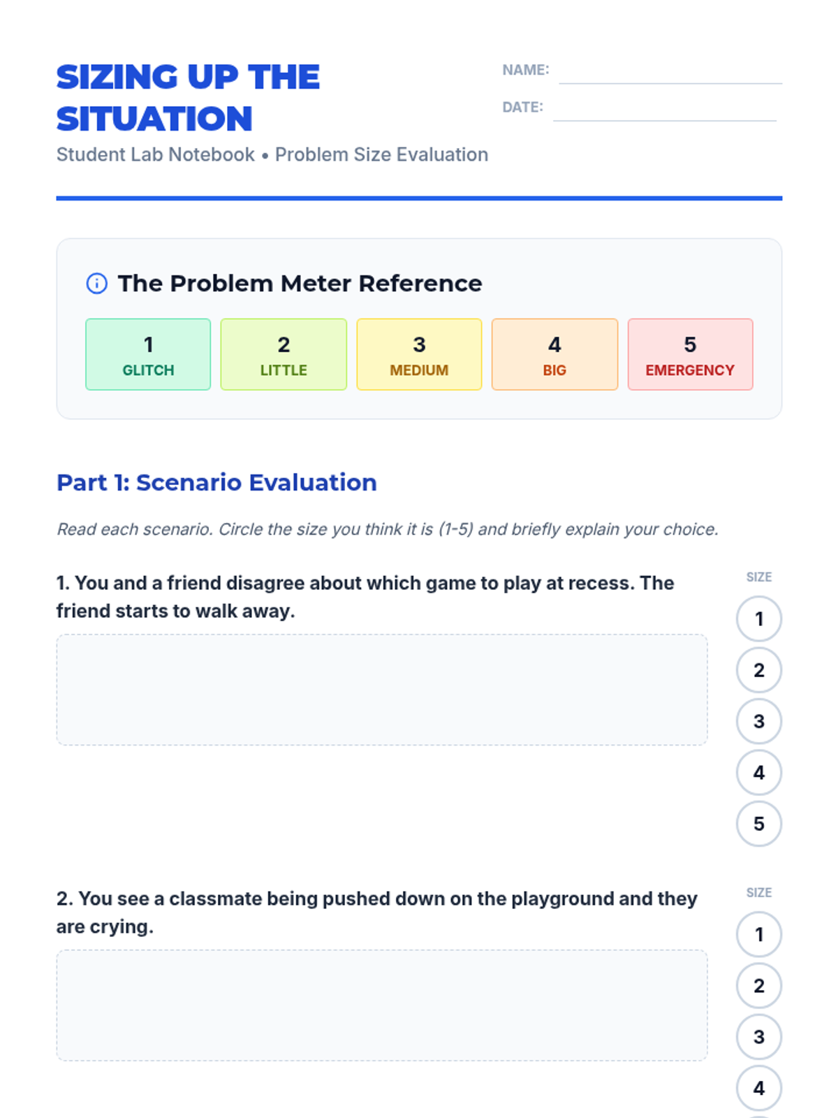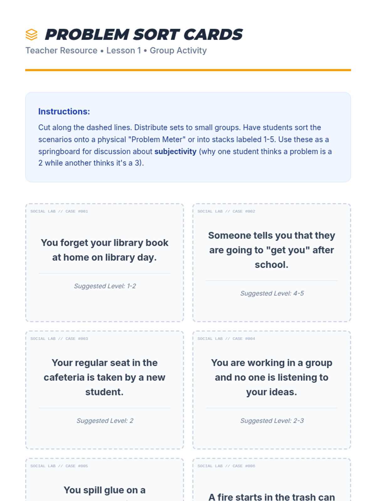 A comprehensive sequence focused on helping 5th-grade students evaluate social problems, match their reactions to problem severity, and develop effective conflict resolution and repair strategies. Students progress from categorization to practical application and synthesis.