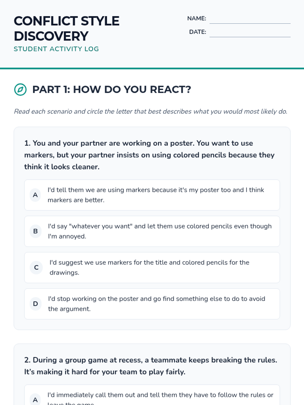 A comprehensive 5th-grade unit on navigating interpersonal conflict through perspective-taking, de-escalation, and negotiation. Students transition from identifying triggers to applying real-time collaborative solutions in complex group settings.