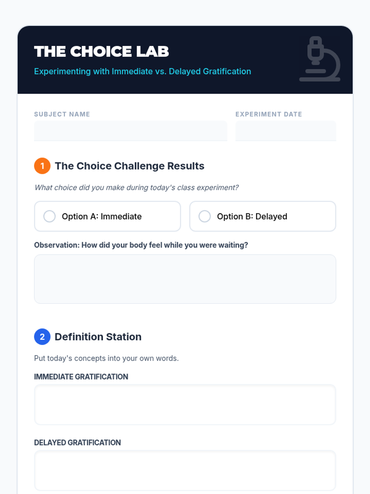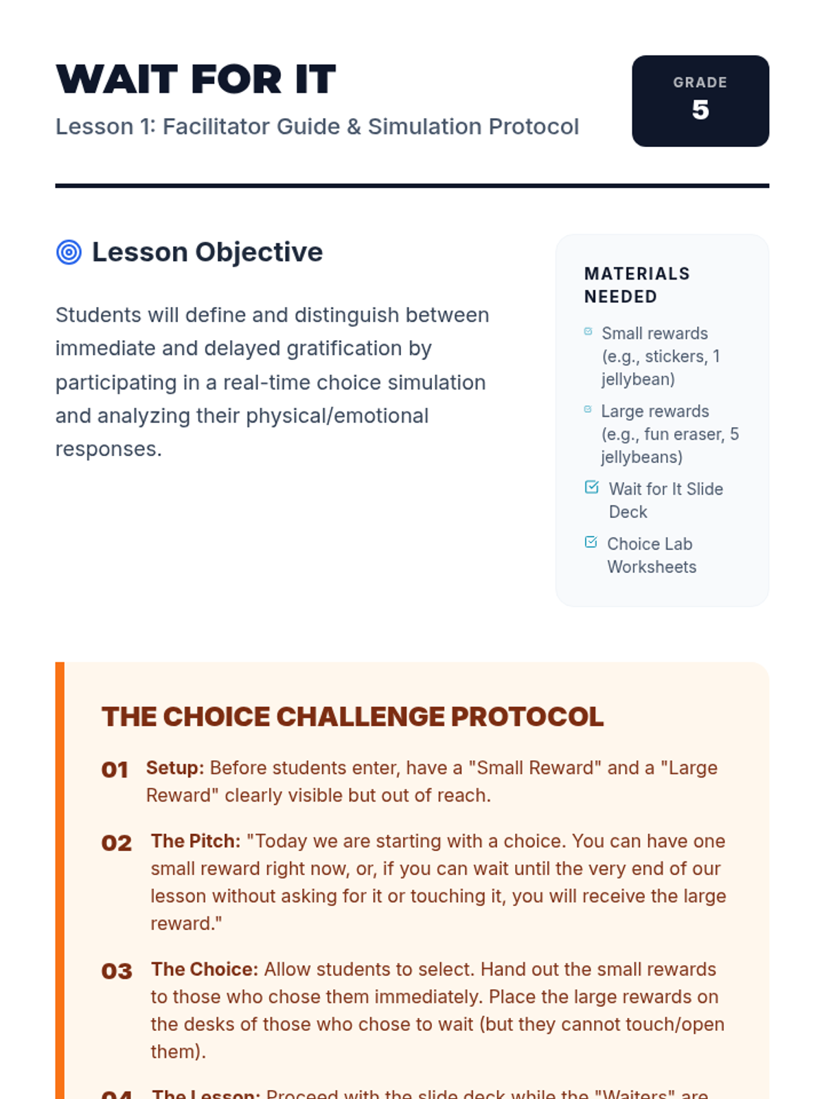 A comprehensive 5-lesson sequence designed to help 5th-grade students understand, identify, and manage impulses through cognitive strategies. Students progress from defining immediate versus delayed gratification to applying advanced distraction and reframing techniques in complex social situations.