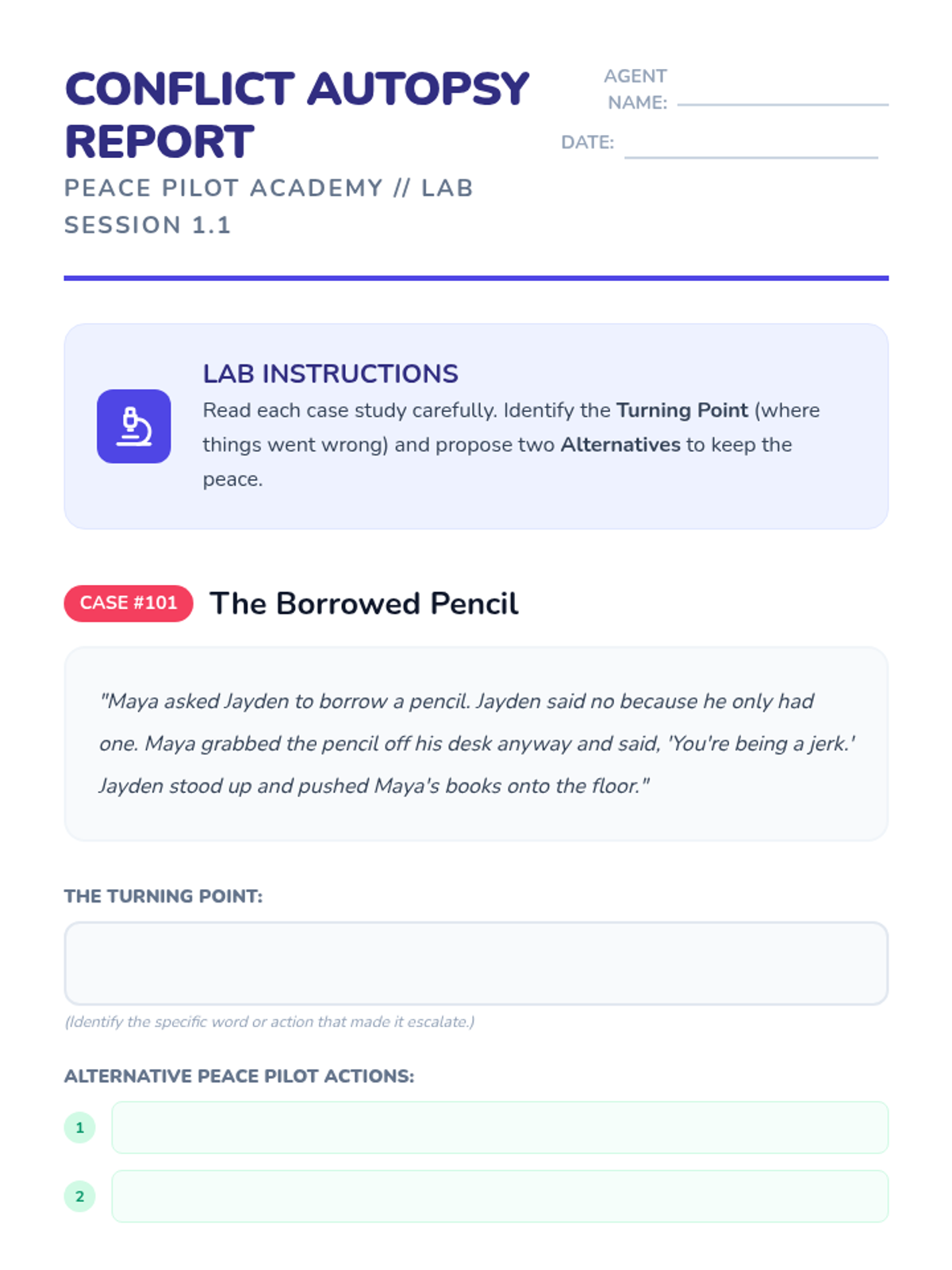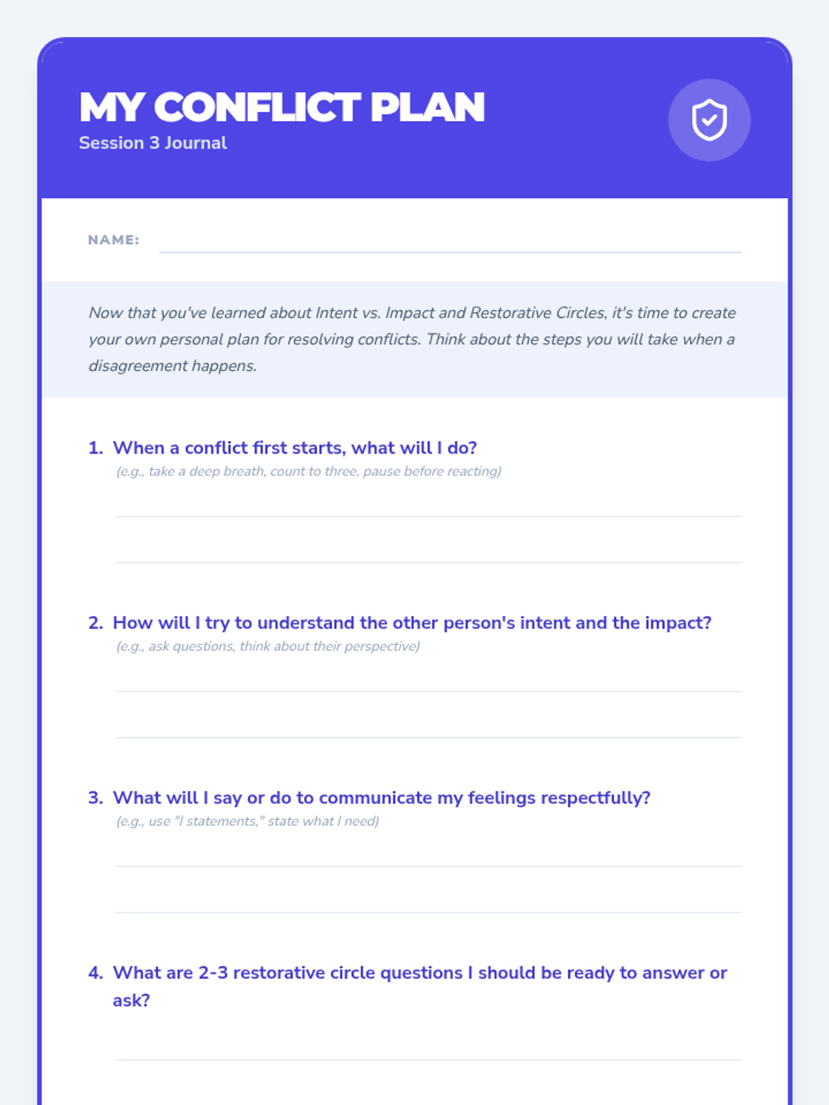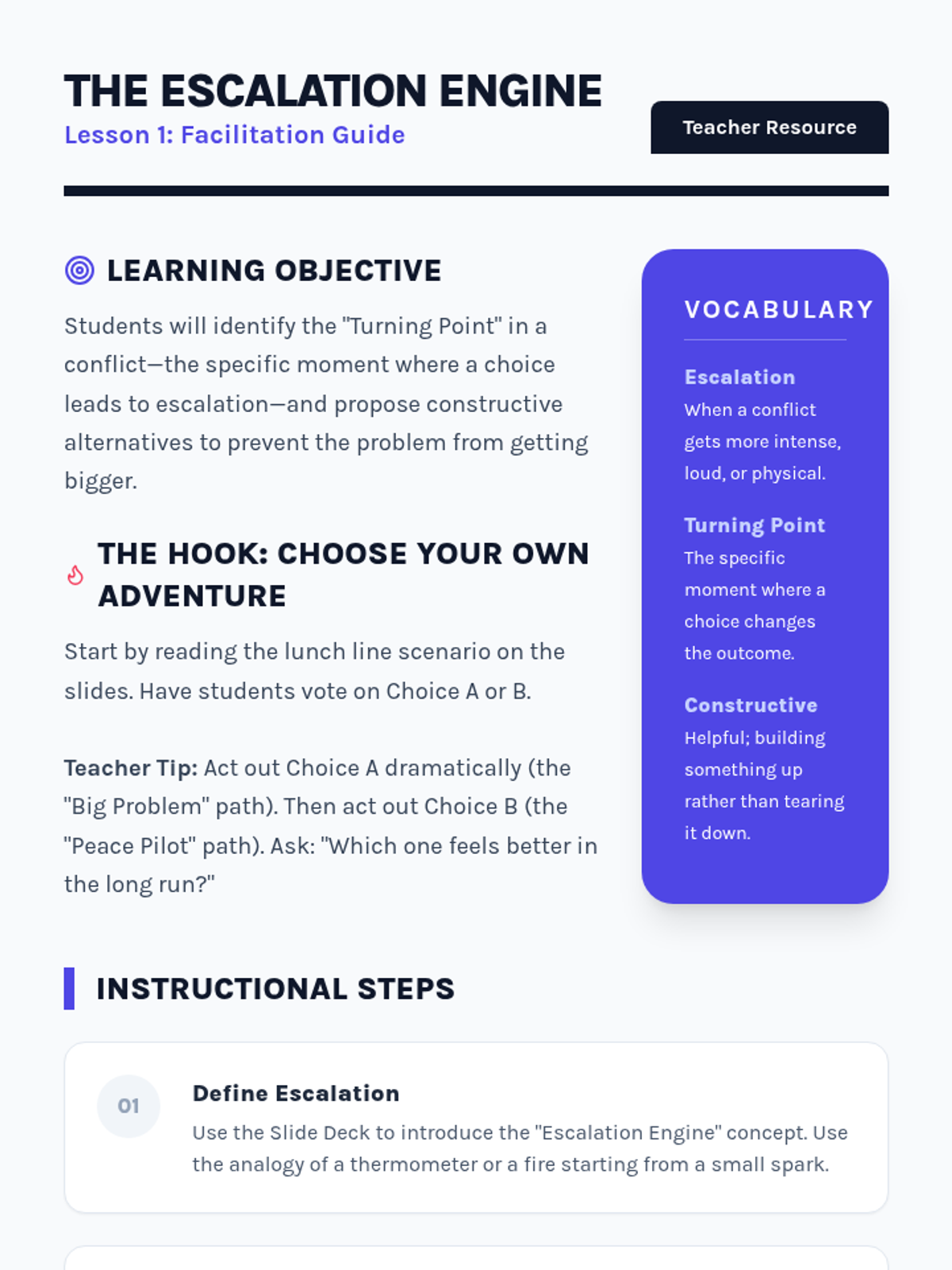 A comprehensive curriculum designed to teach students the essential skills of conflict resolution, de-escalation, and empathetic communication through hands-on tasks and self-reflection.