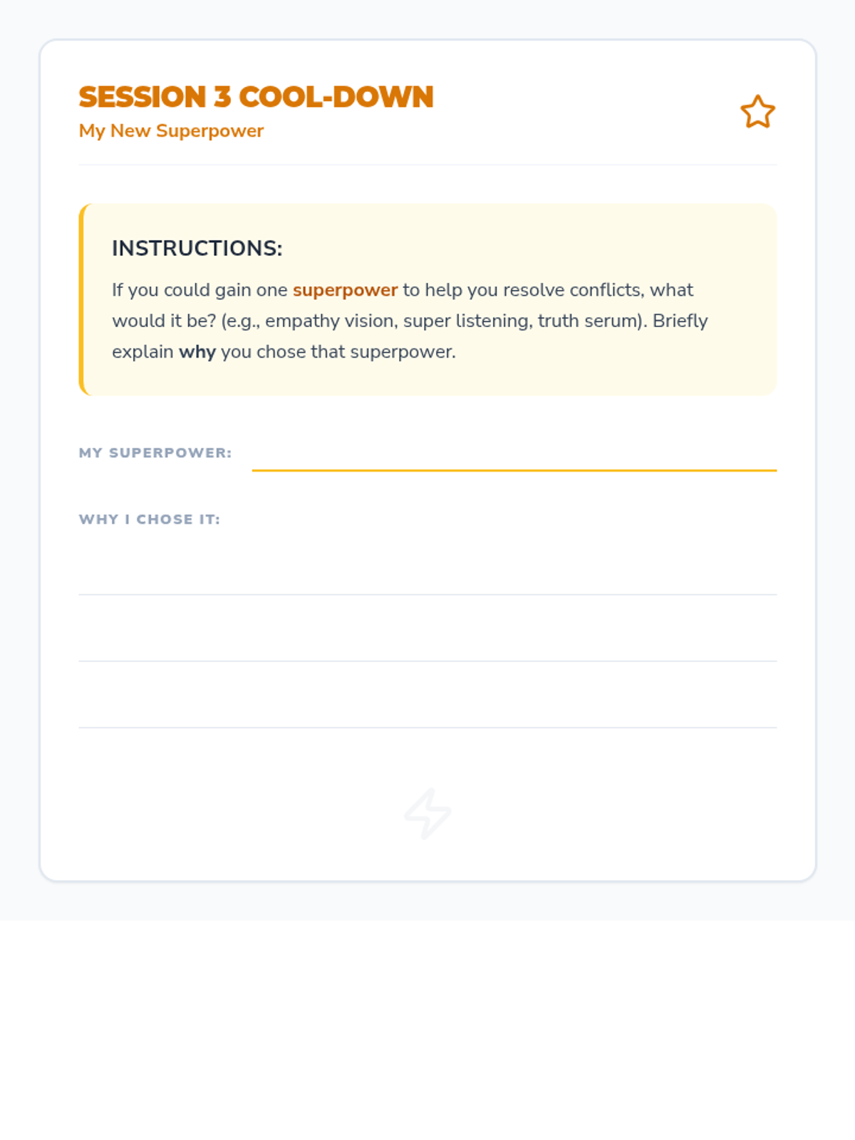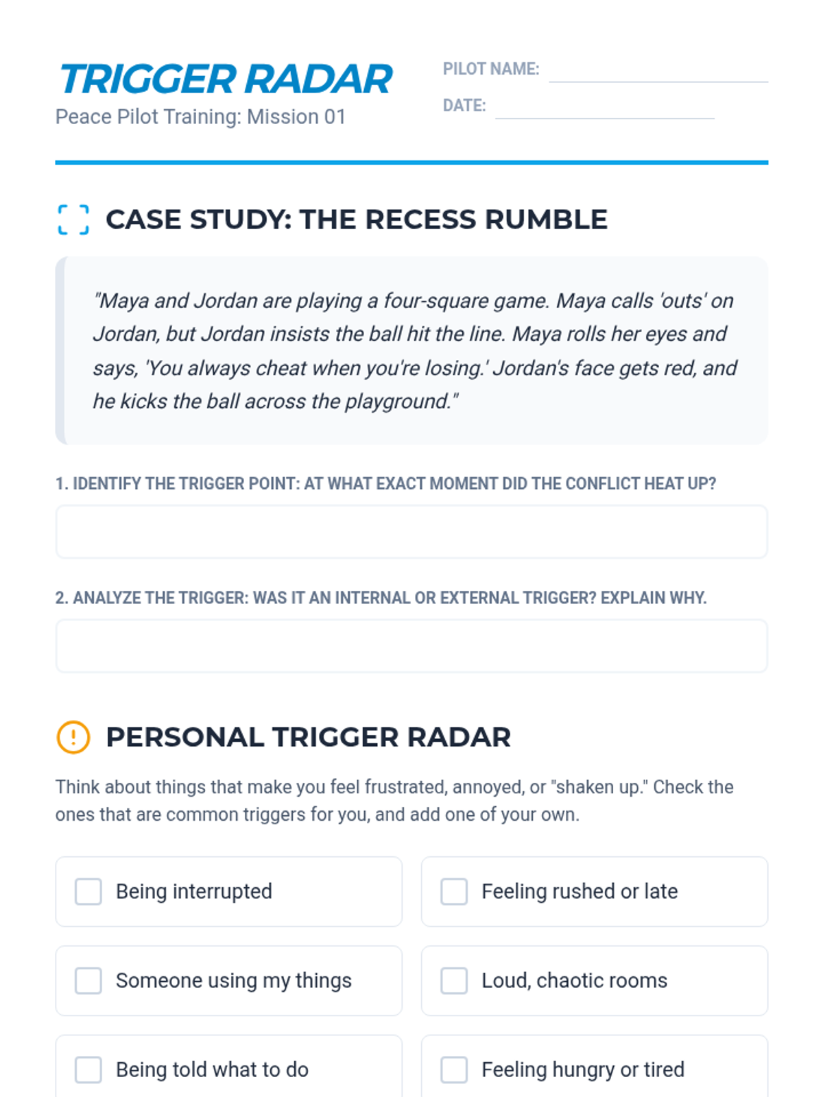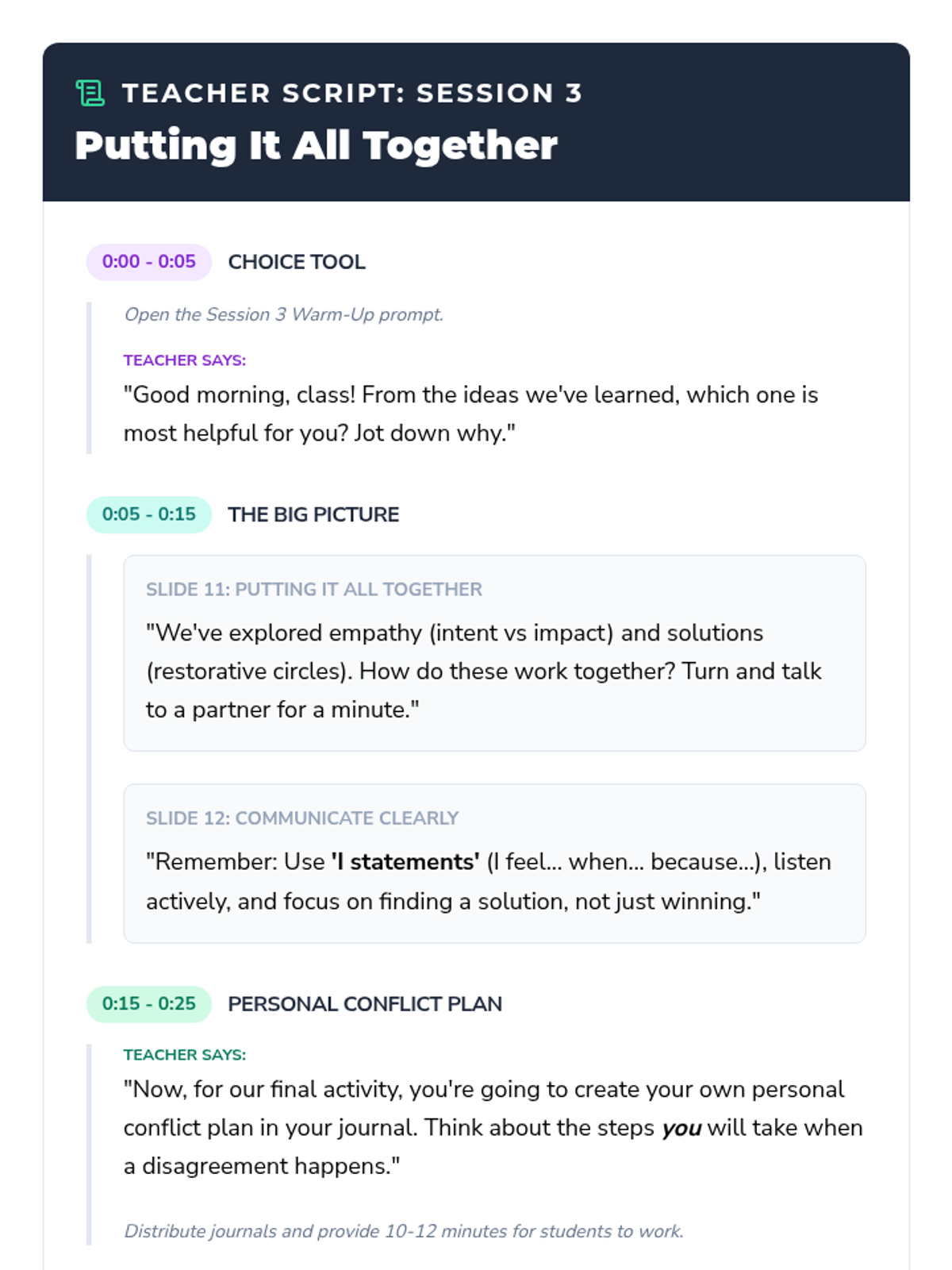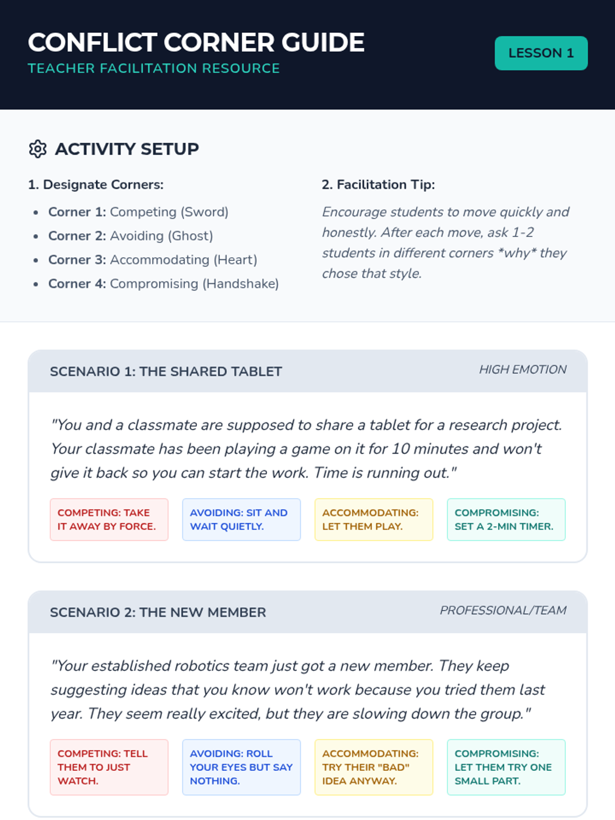 A comprehensive curriculum designed to teach students the essential skills of conflict resolution, de-escalation, and empathetic communication through hands-on tasks and self-reflection.