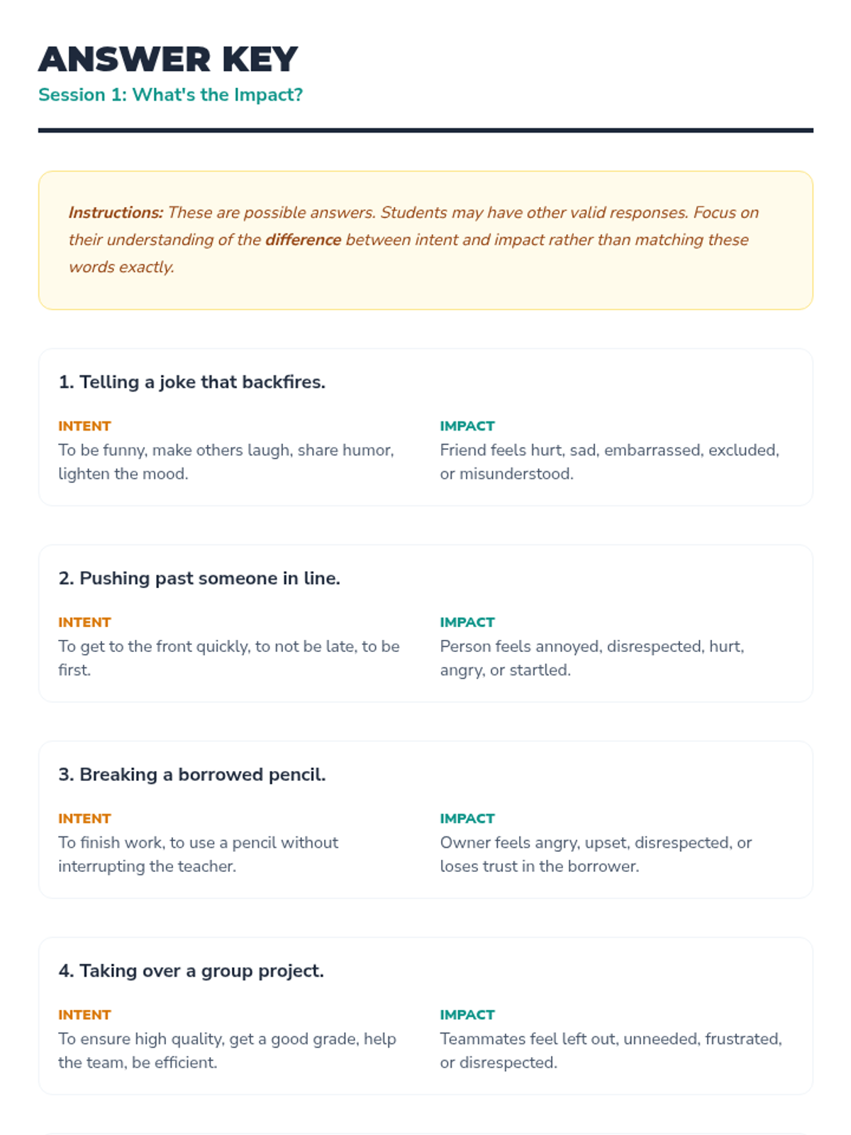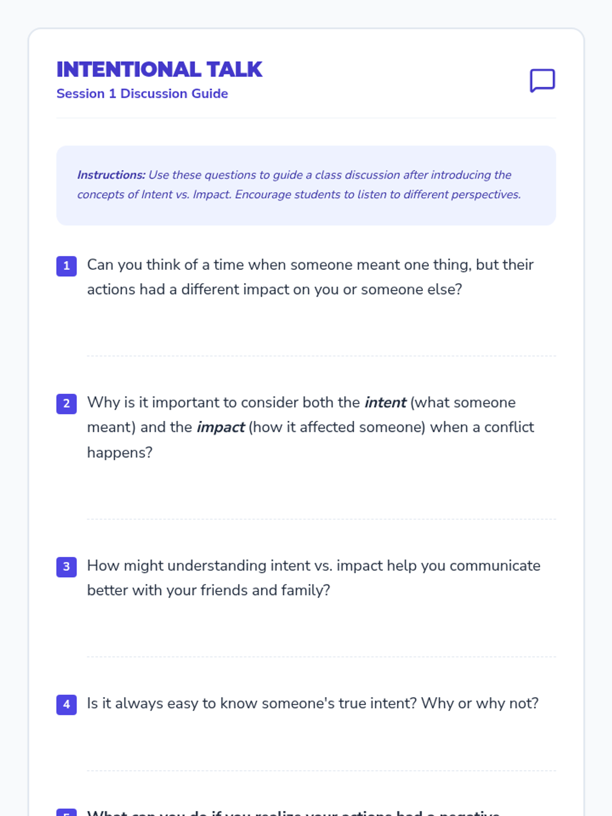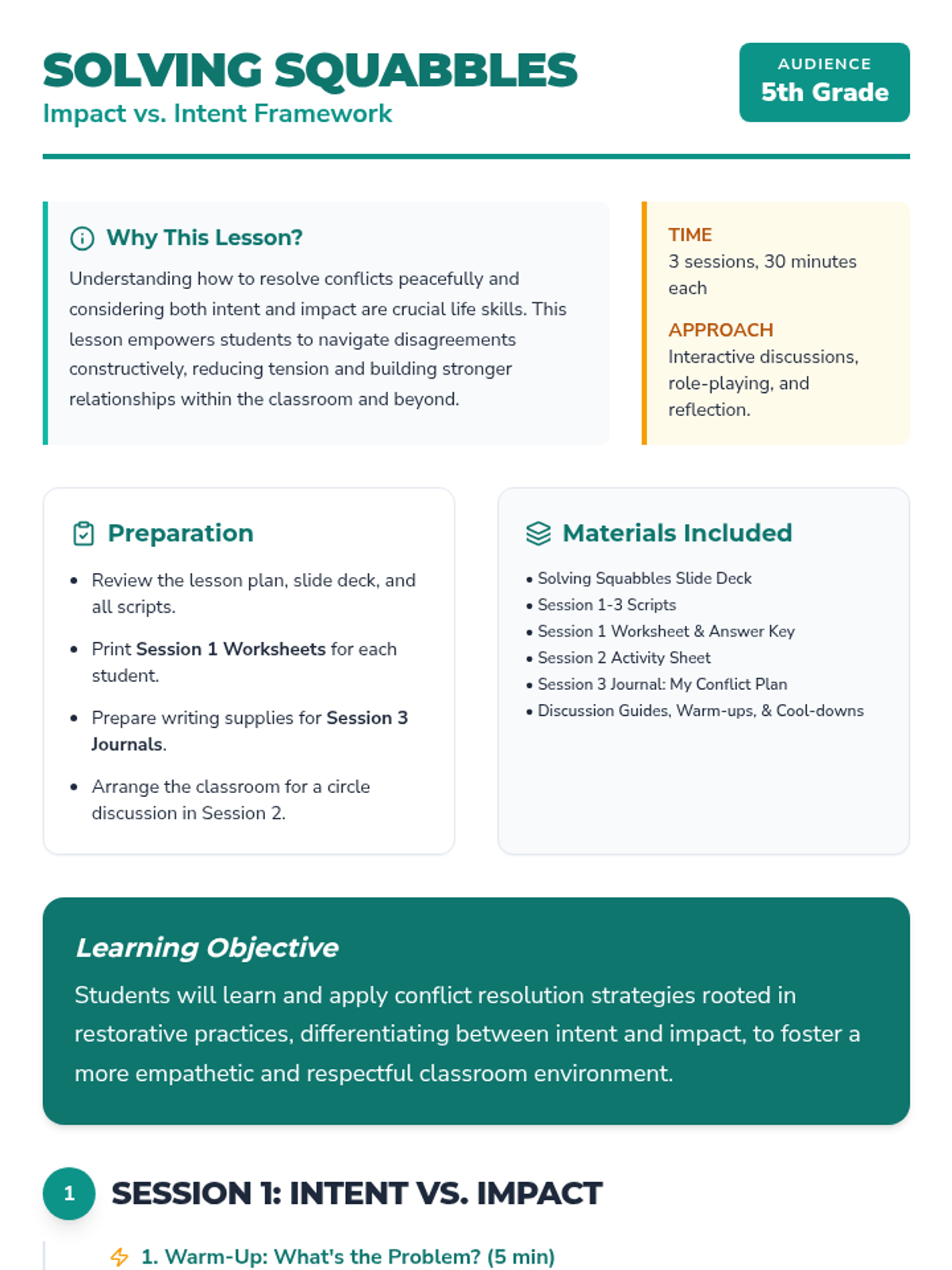 A three-part lesson sequence for 5th graders focused on conflict resolution using the 'impact vs. intent' framework and restorative practices. Sessions are designed for 30-minute morning meetings.