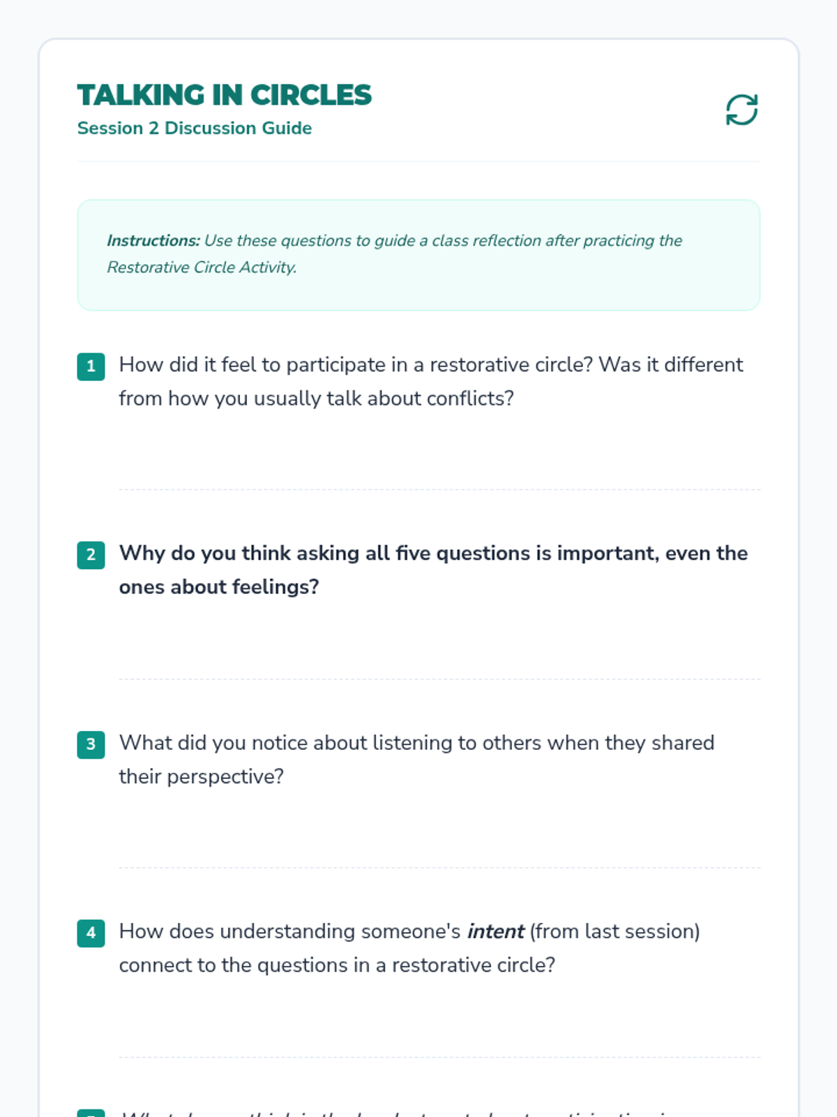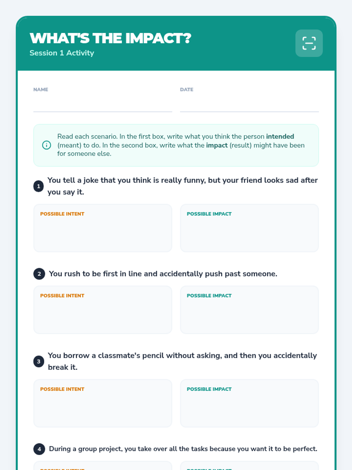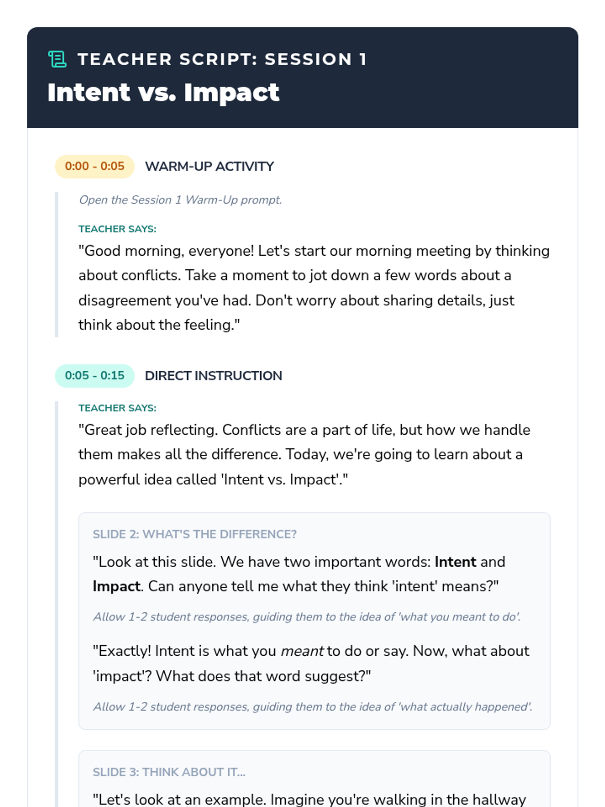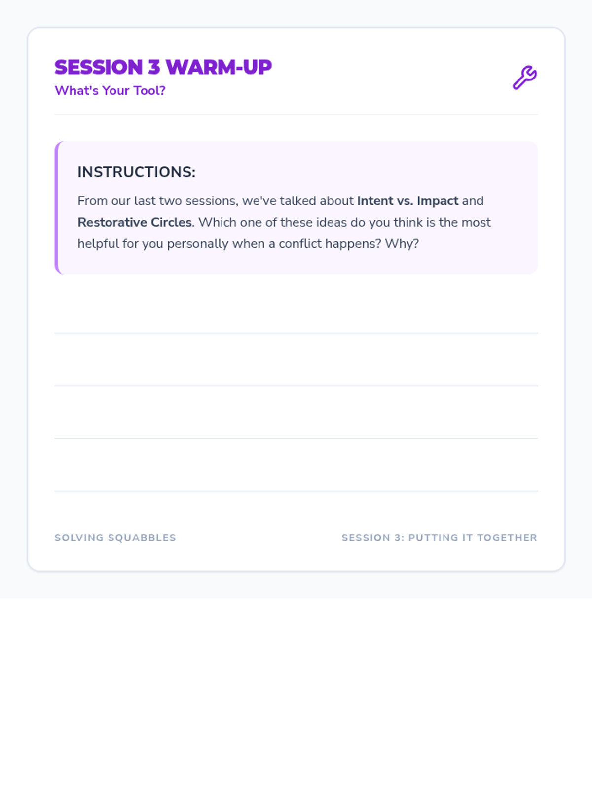 A three-part lesson sequence for 5th graders focused on conflict resolution using the 'impact vs. intent' framework and restorative practices. Sessions are designed for 30-minute morning meetings.