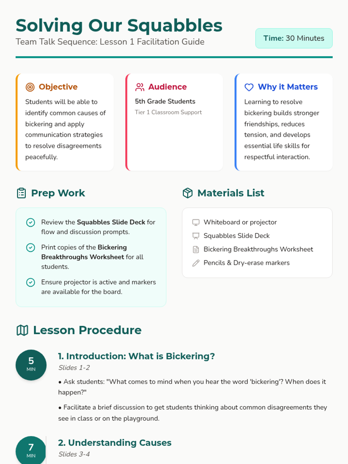 A comprehensive 3-part sequence for 5th graders focused on social-emotional skills, communication, and conflict resolution. Students learn to handle bickering, understand their circle of control, and mediate conflicts using empathy and active listening.