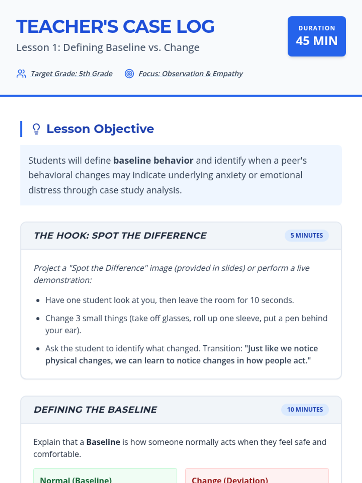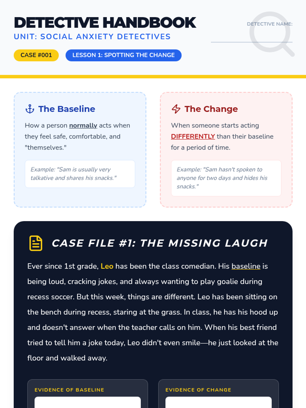 A 5-lesson sequence for 5th graders focused on identifying behavioral signs of anxiety. Students learn to observe changes in behavior as signals of emotional distress using a 'behavior detective' theme, building empathy and practical observation skills.