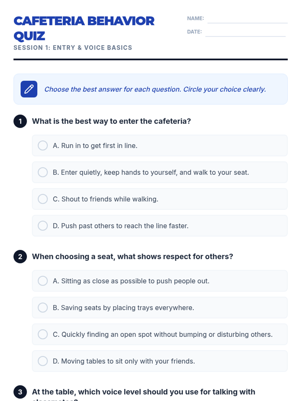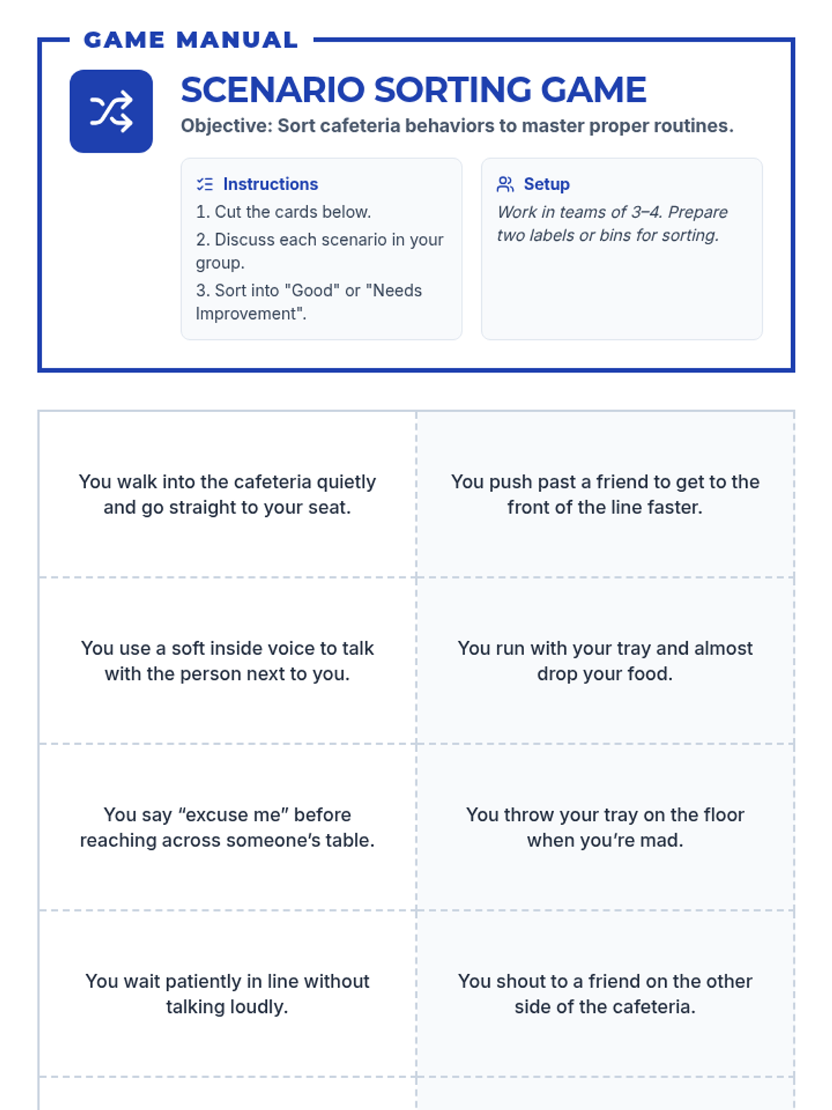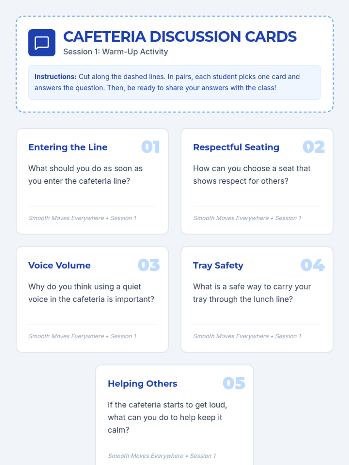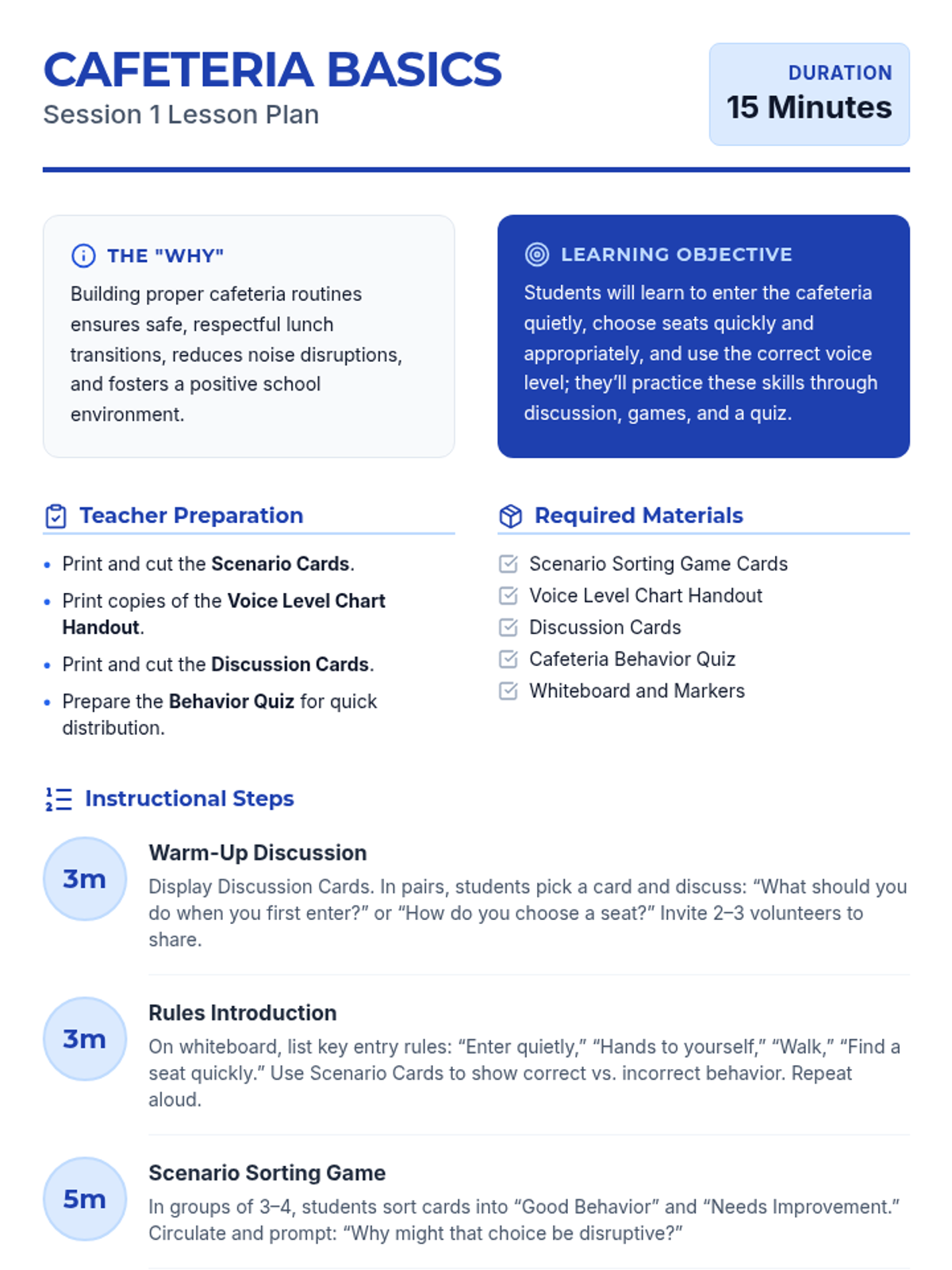 A 4-session classroom behavior series focused on teaching students positive cafeteria and hallway habits through interactive discussions, games, and practice.