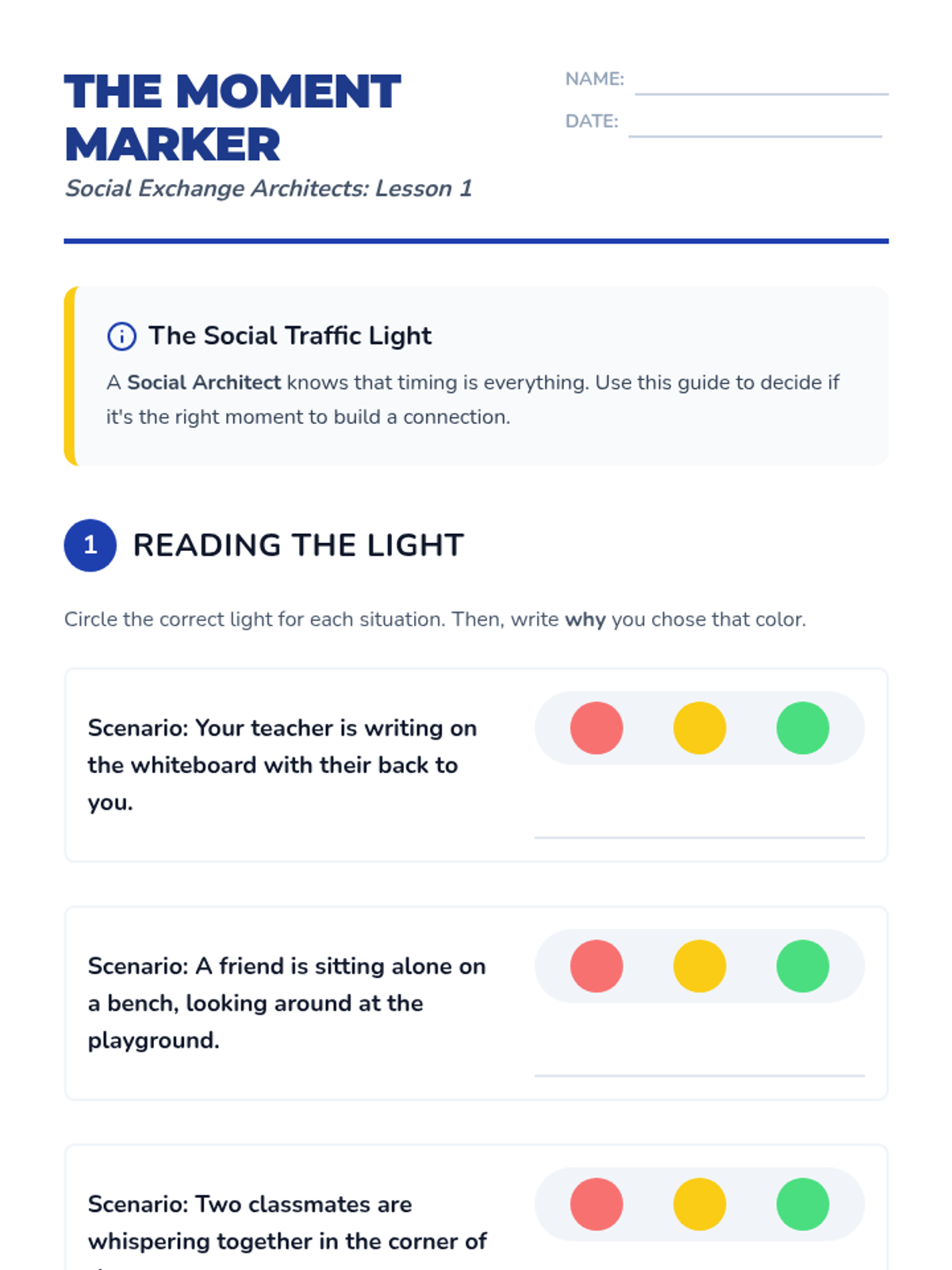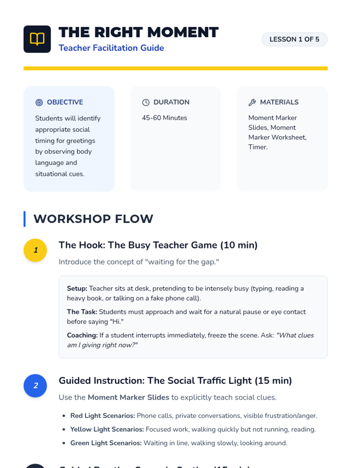 A curriculum designed to help middle and early high school students master the art of situational awareness. By explicitly teaching how to 'read the room' and interpret subtle social cues, this sequence reduces social friction and helps students navigate complex classroom and peer environments with confidence.