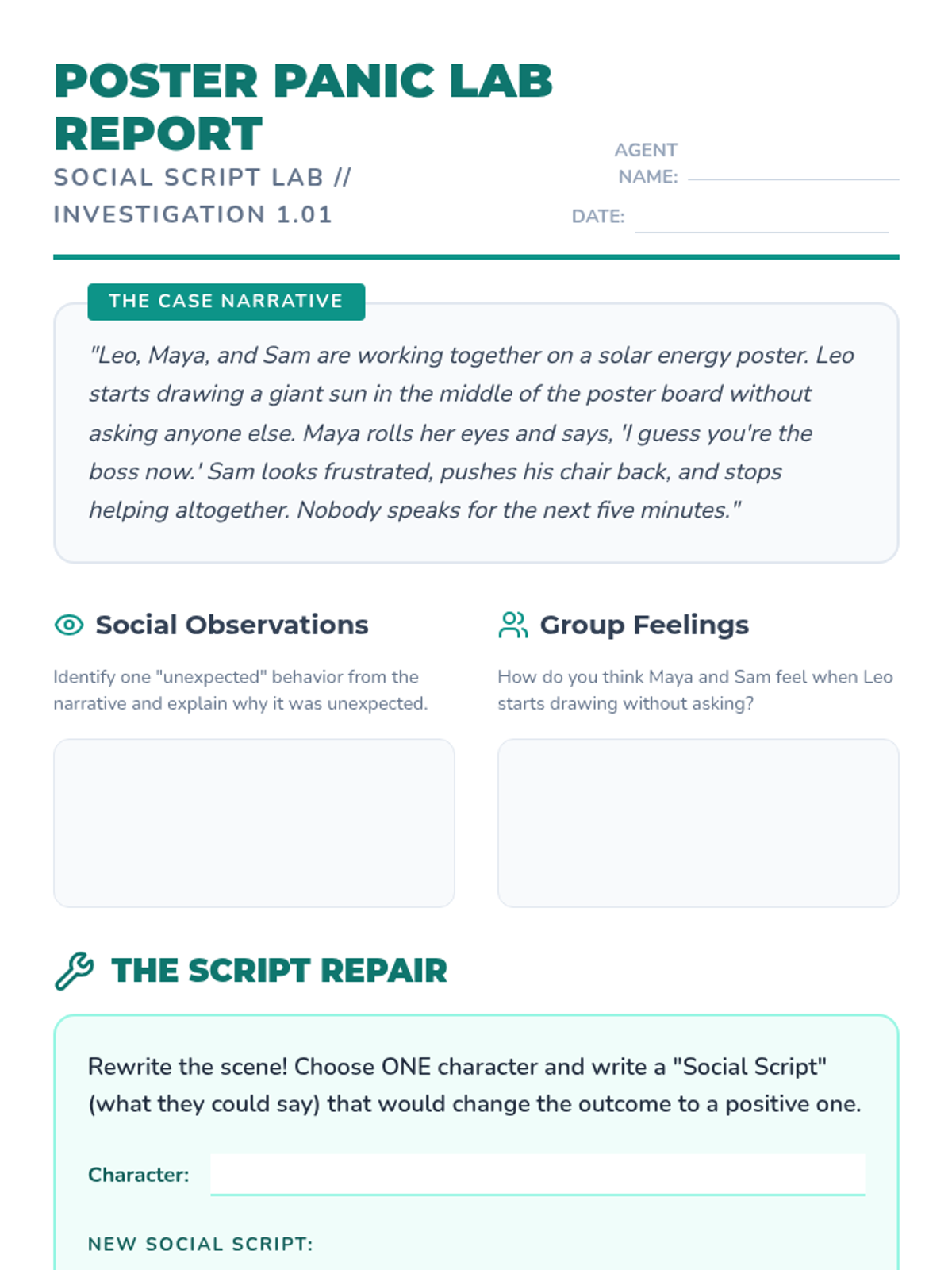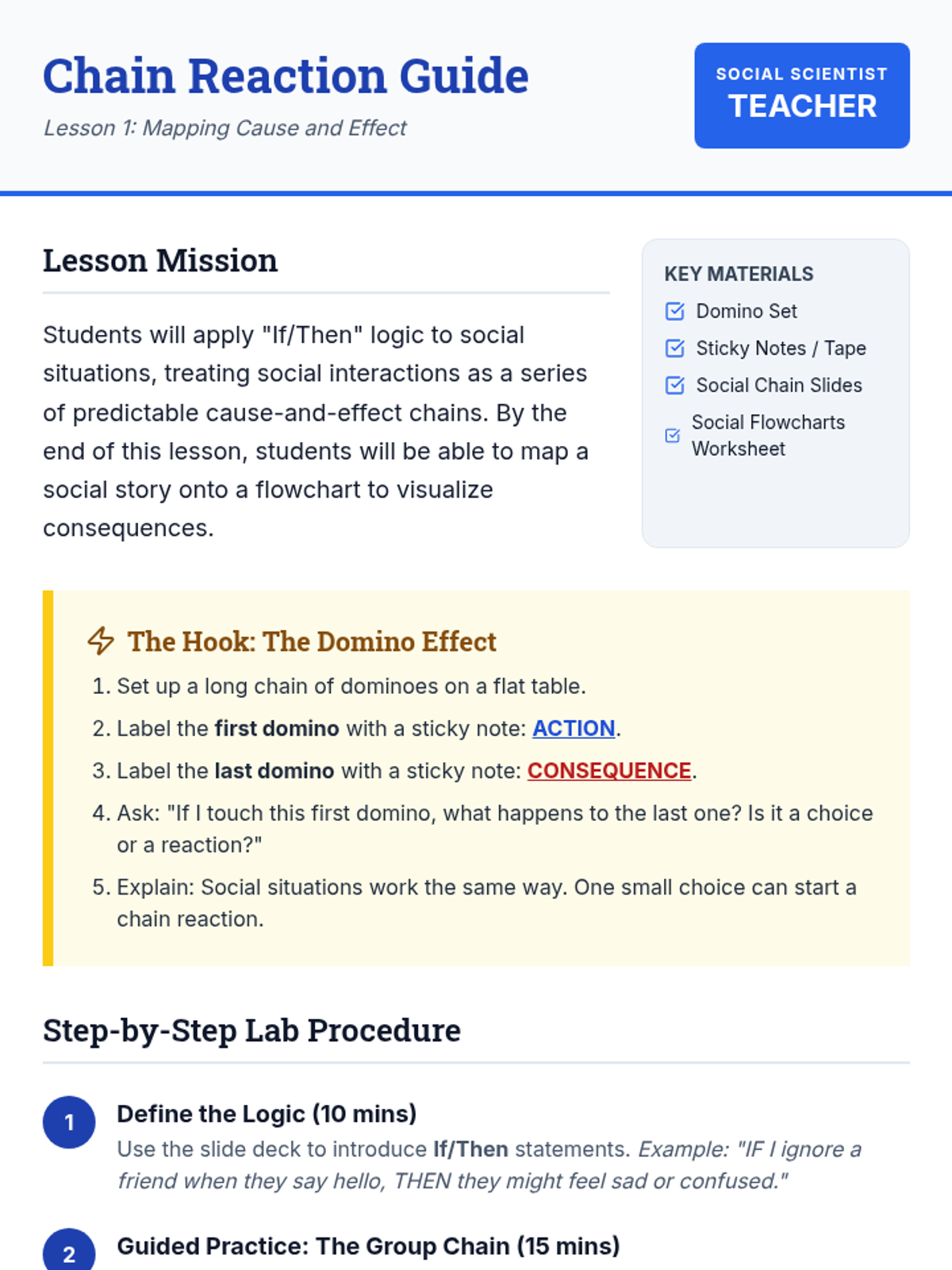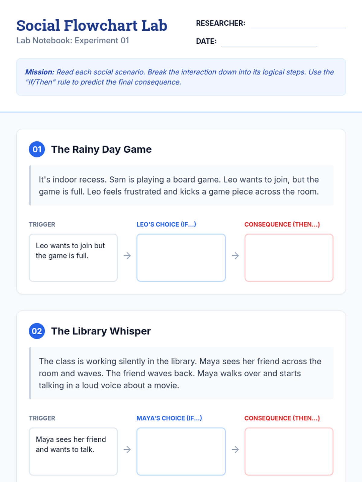 A 5th-grade social science approach to understanding social interactions. Students act as 'Social Scientists' to map cause-and-effect, analyze non-verbal cues, and predict outcomes using the logical framework of social stories.
