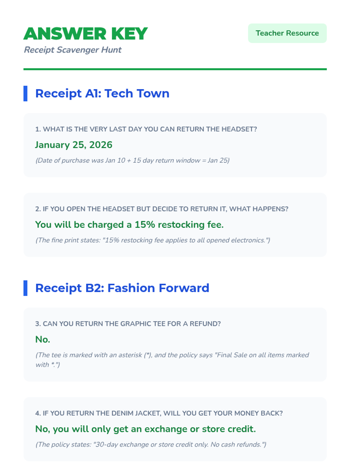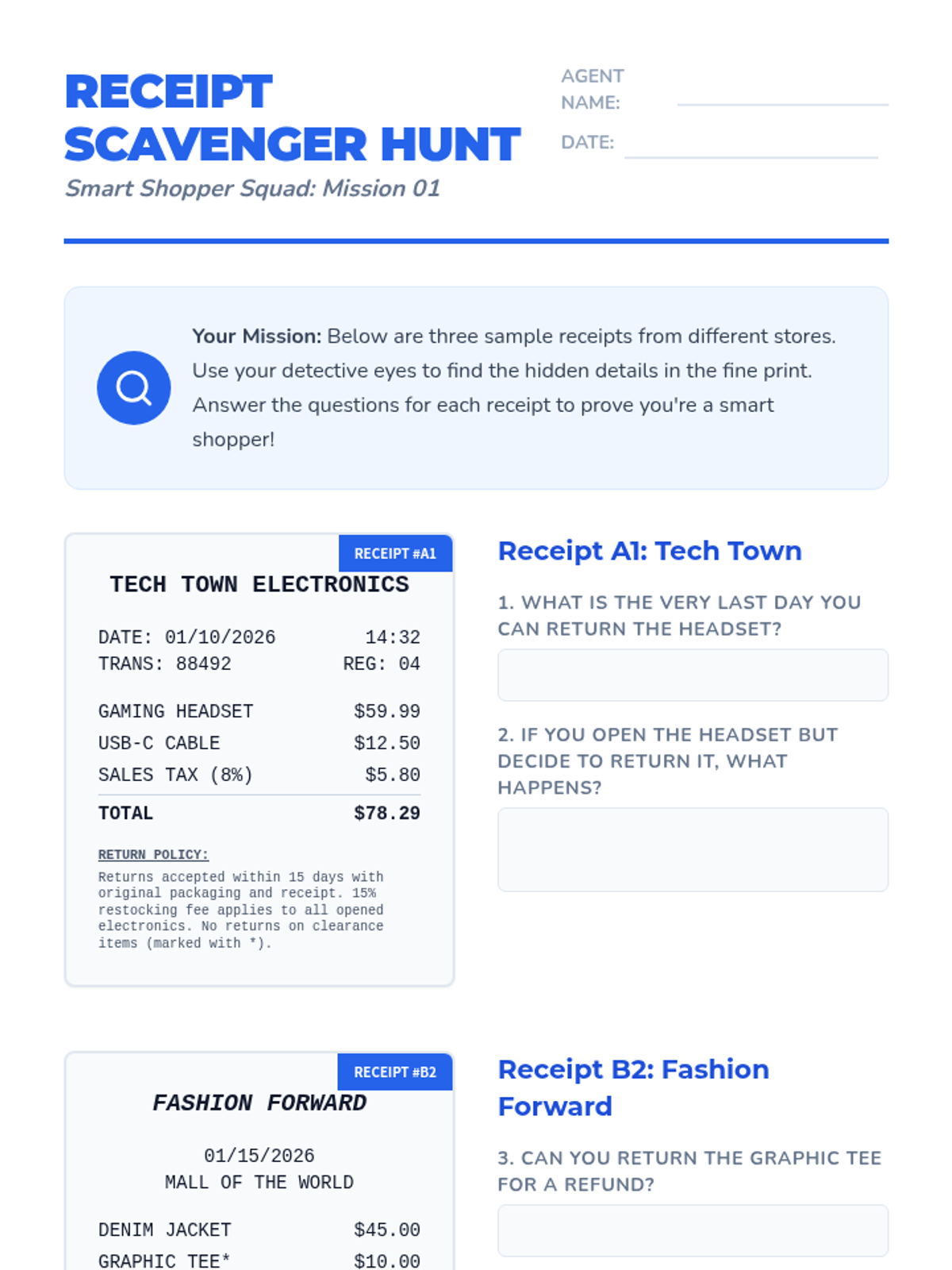 This sequence teaches 5th-grade students about their rights and responsibilities as consumers after a purchase. Students learn to navigate return policies, understand warranties, practice assertive communication, and explore the ethical impact of their spending choices.