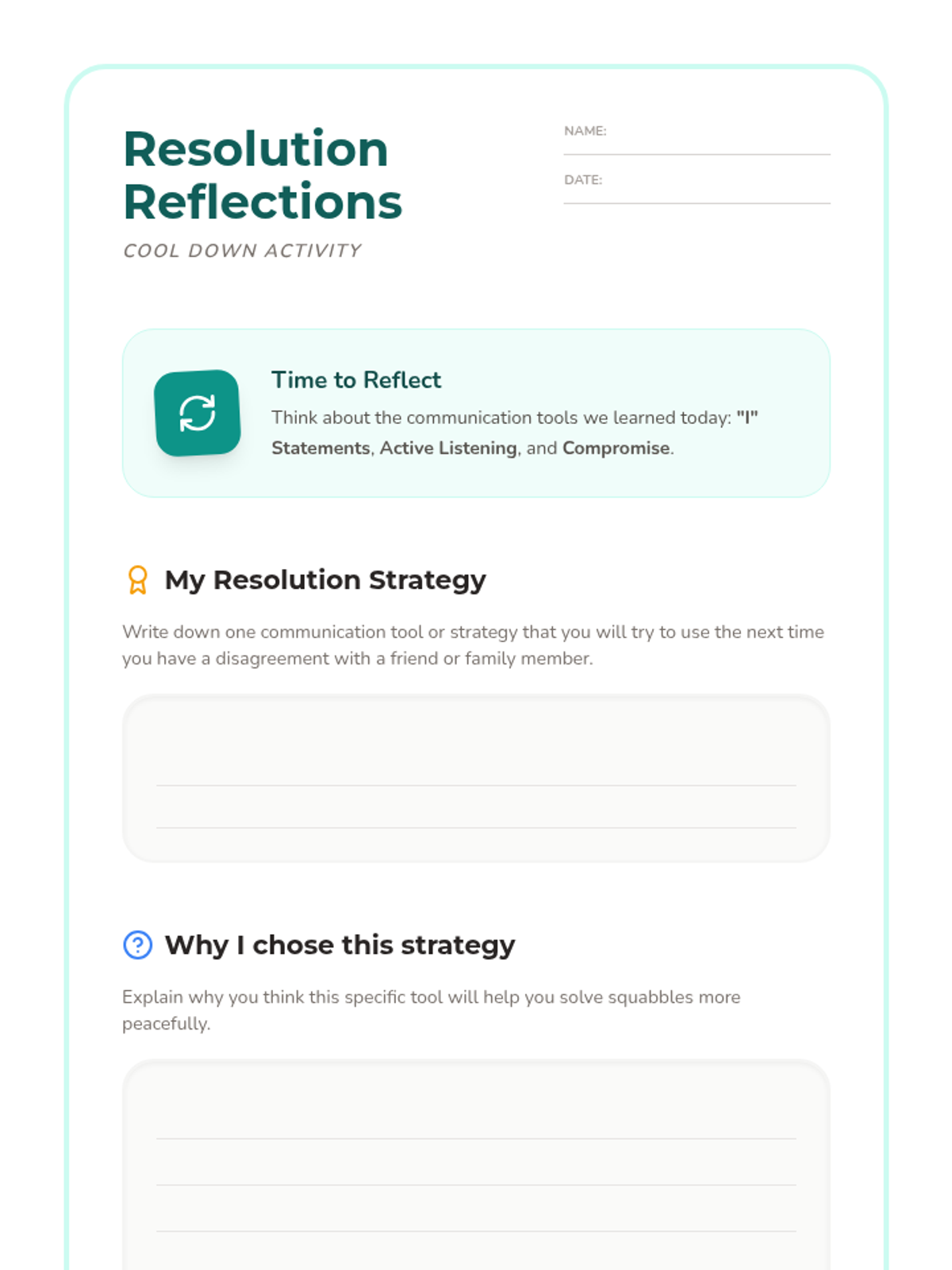 Students move from reactive emotional responses to proactive negotiation. They learn de-escalation, empathy through perspective-taking, and a structured 4-step 'Peace Path' to resolve playground and classroom conflicts independently.