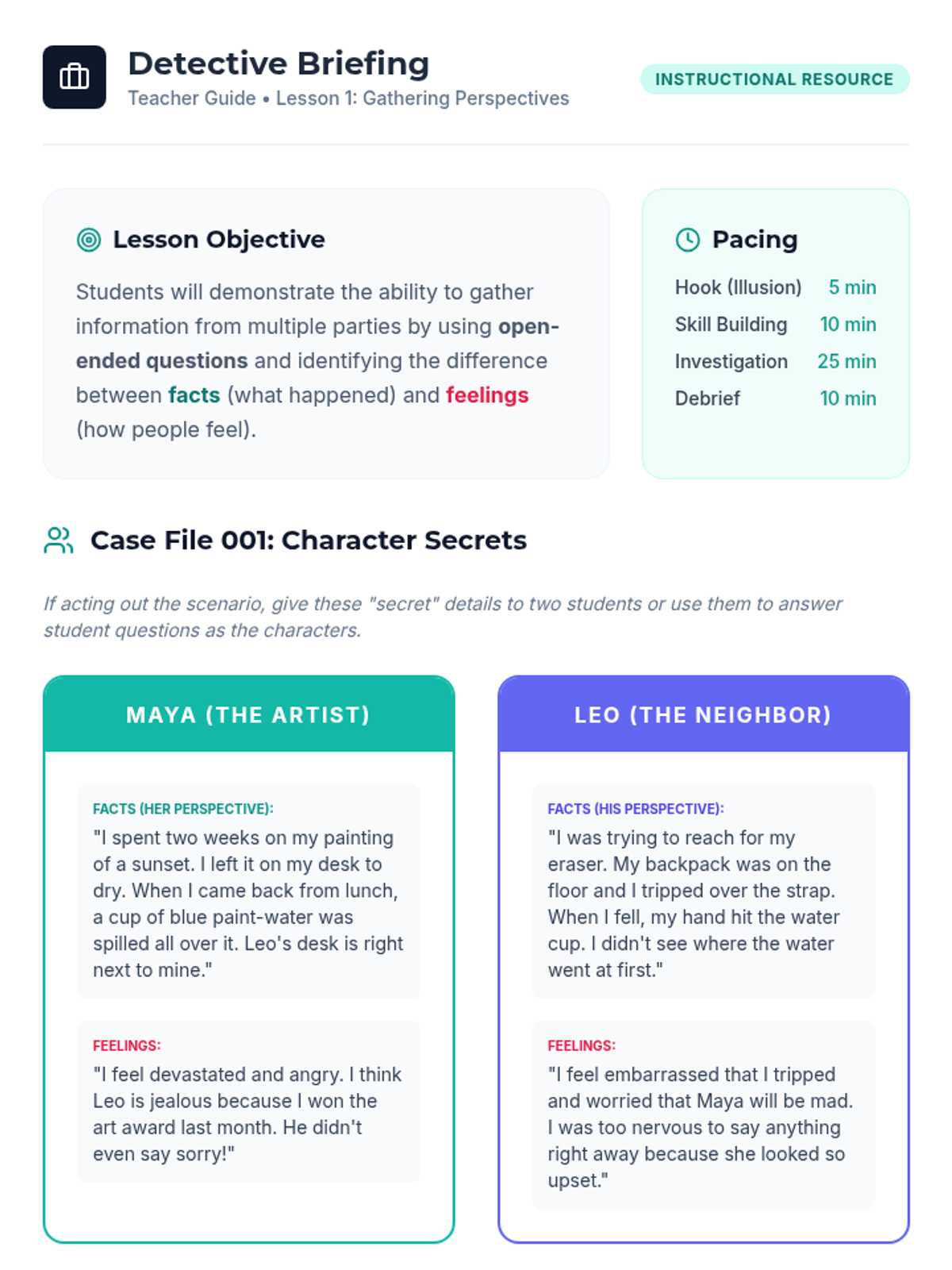 An 8-week social cognition unit focused on perspective-taking for 5th-grade students. Using a "Social Detective" theme, students learn to identify physical viewpoints, emotional states, information gaps, and conflicting motives to better navigate social interactions.
