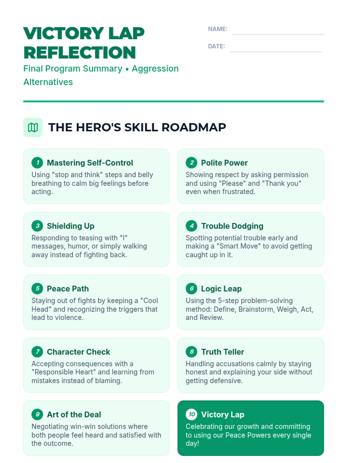 An 8-week (10-session) Tier 2 social skills program for 3rd-5th graders focusing on aggression alternatives, self-control, and peaceful conflict resolution.