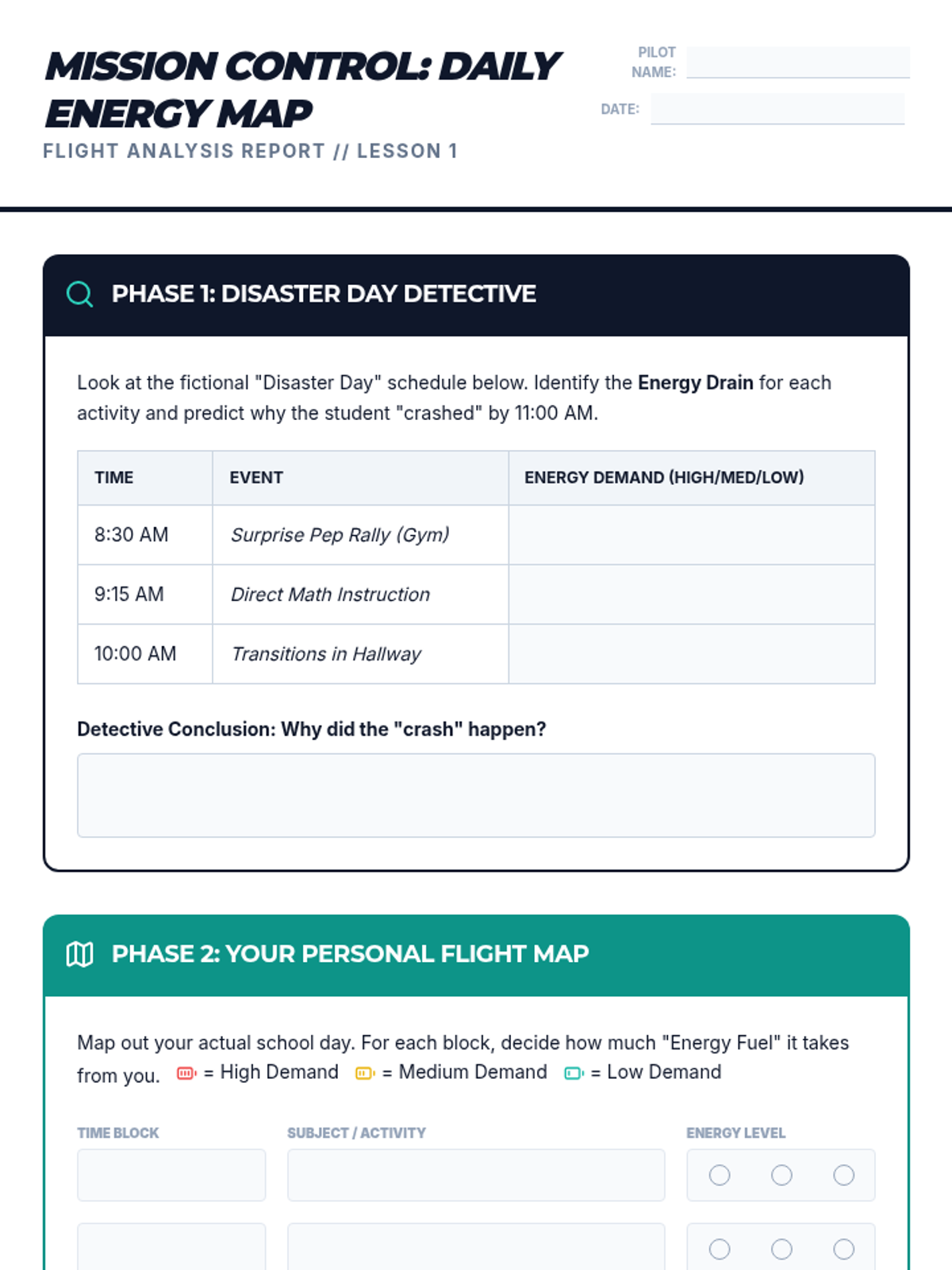 A 5-lesson unit for 5th graders to design, schedule, and advocate for their own sensory regulation plans using a 'Mission Control' theme. Students move from analyzing their day to creating a customized 'sensory diet' and learning how to communicate their needs to teachers.