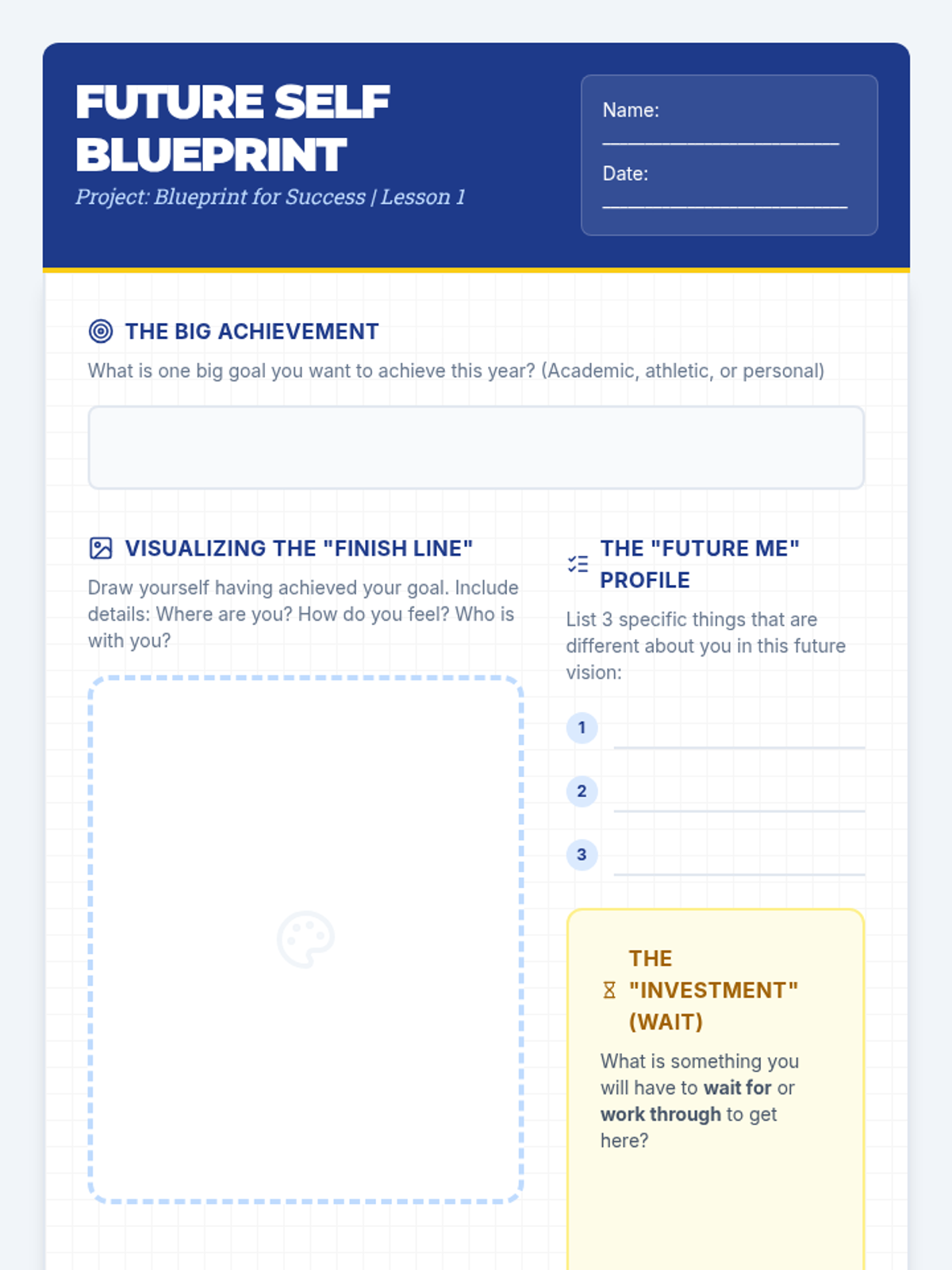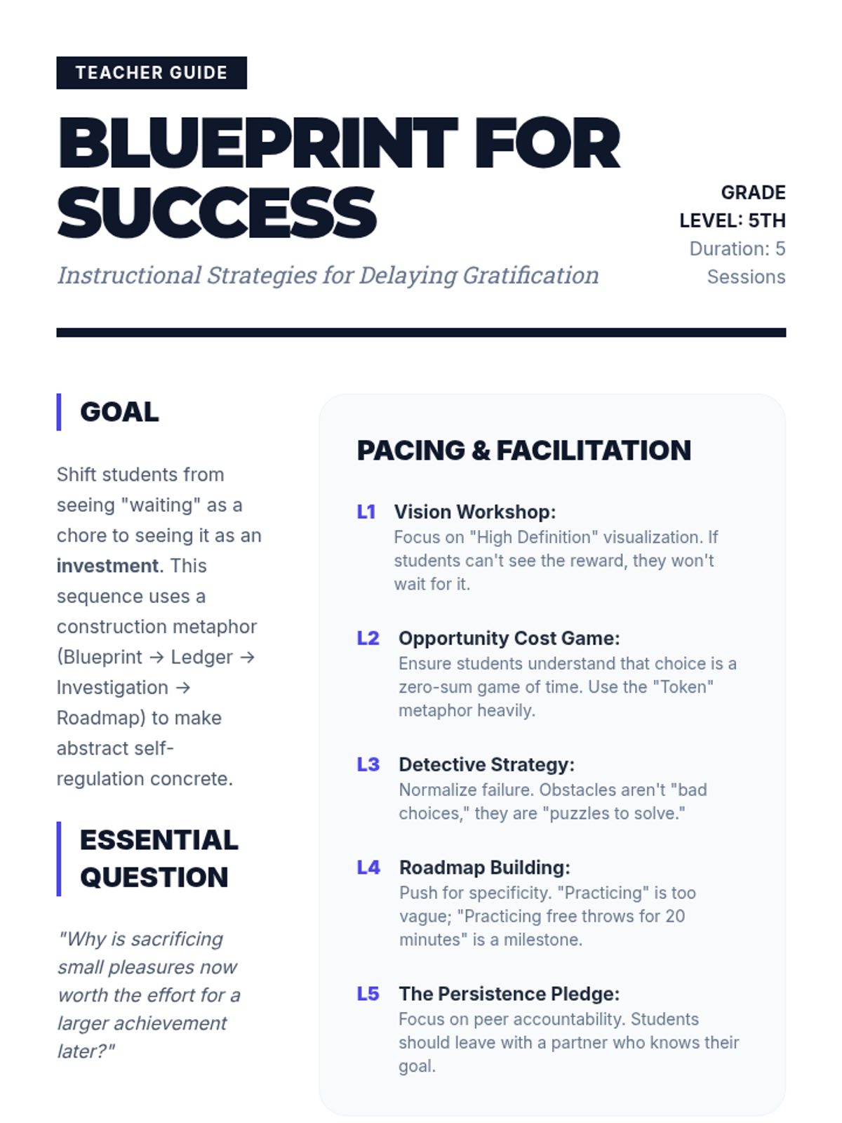 A project-based sequence for 5th graders that teaches delaying gratification through goal setting. Students learn to visualize future success, differentiate between immediate wants and long-term needs, and create a structured roadmap to achievement.