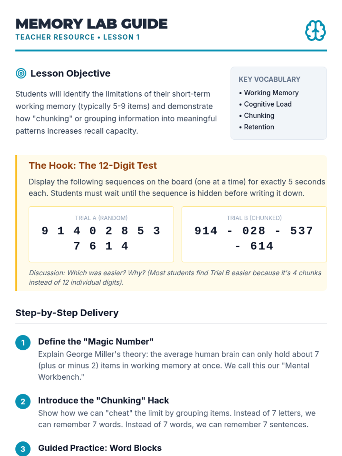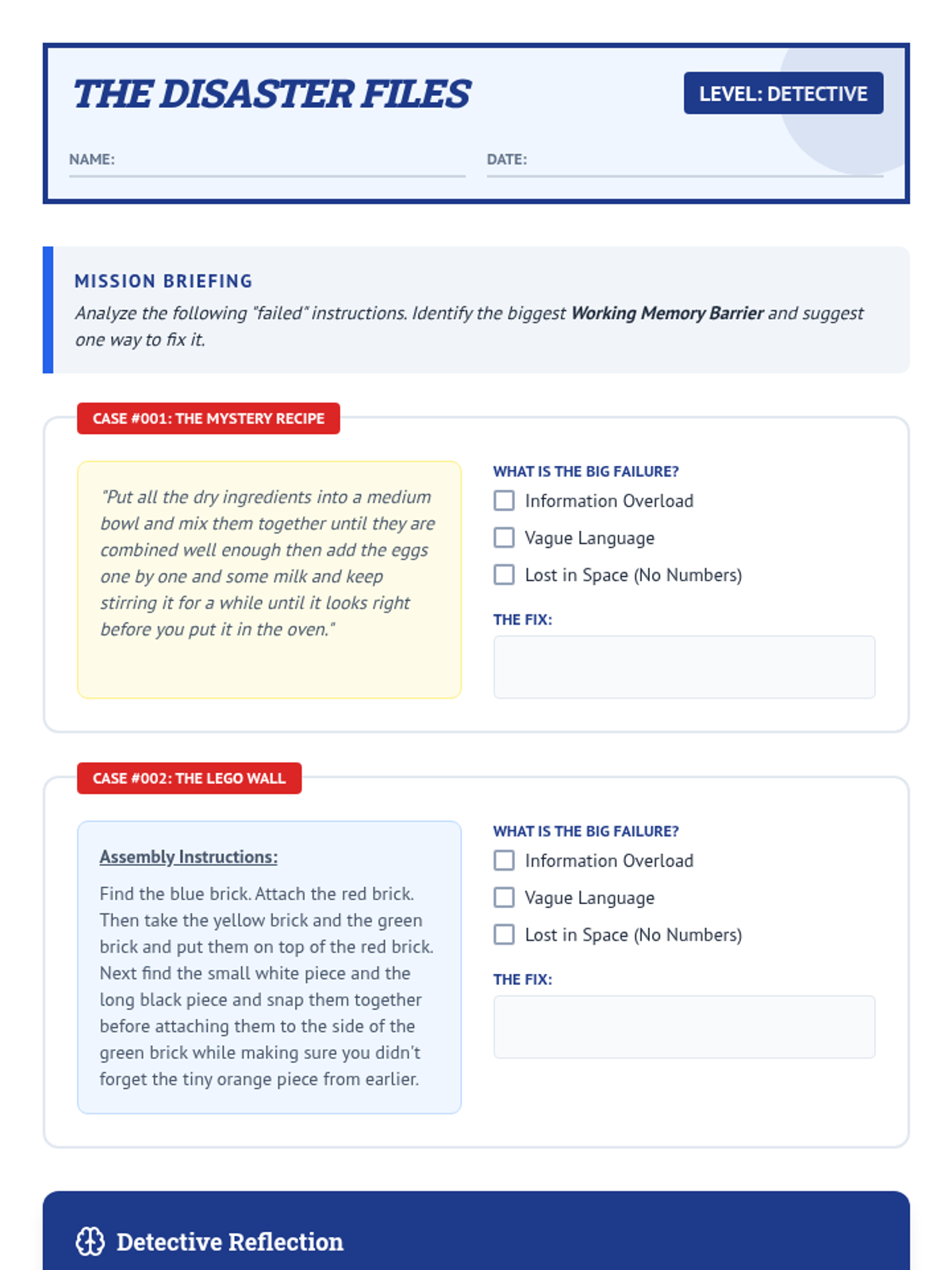 A 5-lesson sequence for 5th-grade students focused on working memory and the importance of single-step directions. Students learn to analyze, reconstruct, and advocate for clear communication through case studies, games, and collaborative challenges.