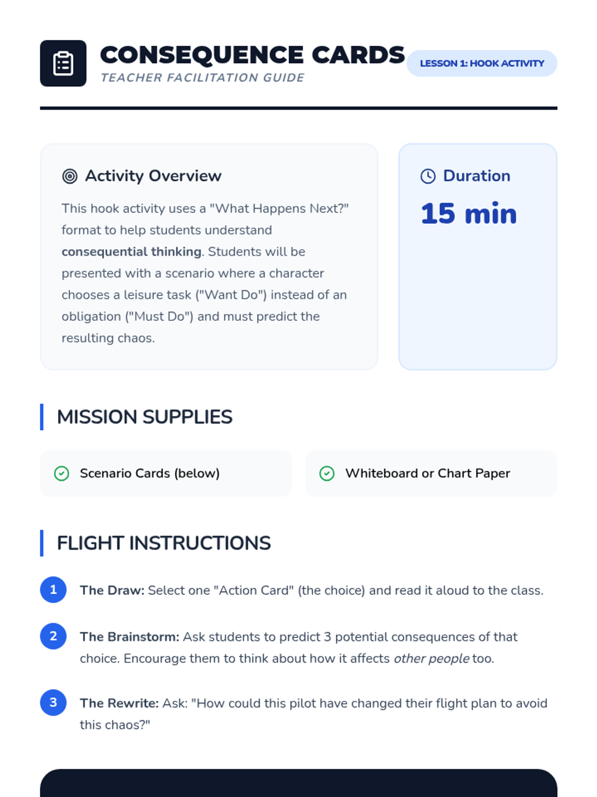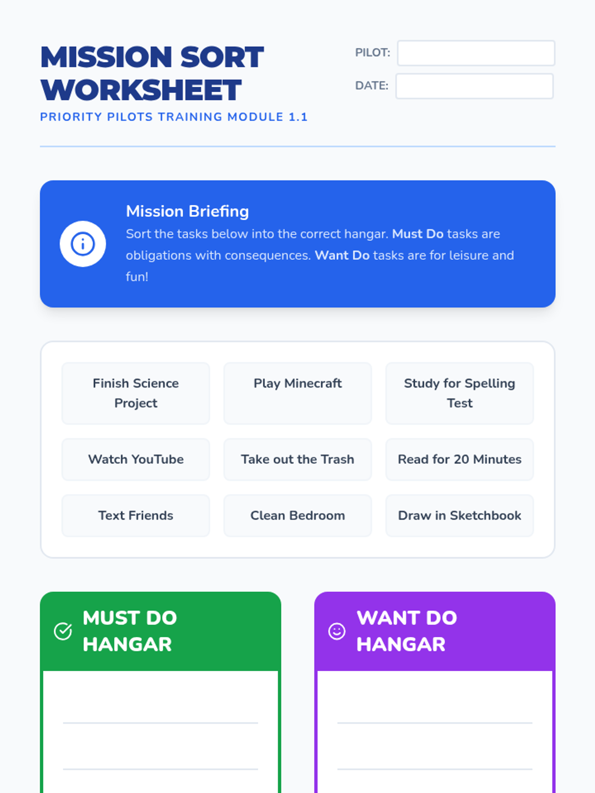 This sequence teaches 5th-grade students essential executive functioning skills for task prioritization. Students learn to distinguish between obligations and leisure, use a traffic light system for urgency, estimate time and effort, sequence multi-step projects, and create their own weekly plans using an aviation-inspired theme.