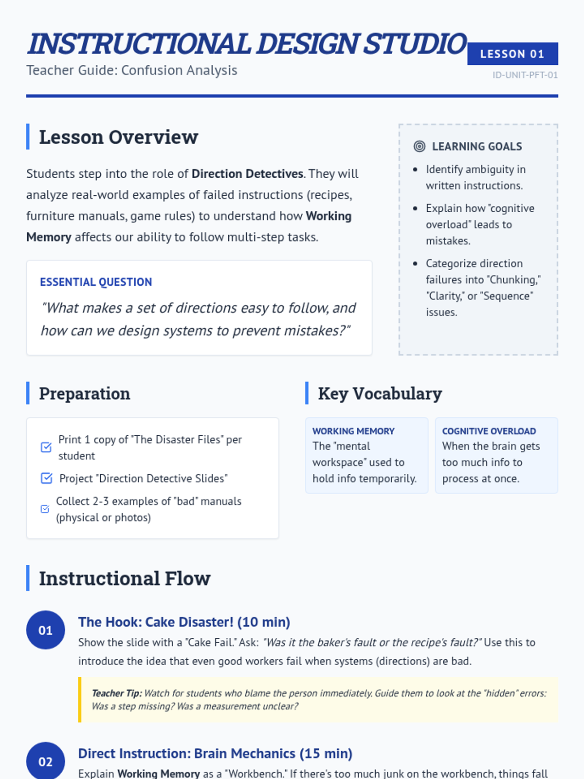 A 5th-grade project-based unit where students act as 'Instructional Designers' to master multi-step direction following. By analyzing bad instructions and designing their own, students build metacognitive awareness of working memory and executive function supports.