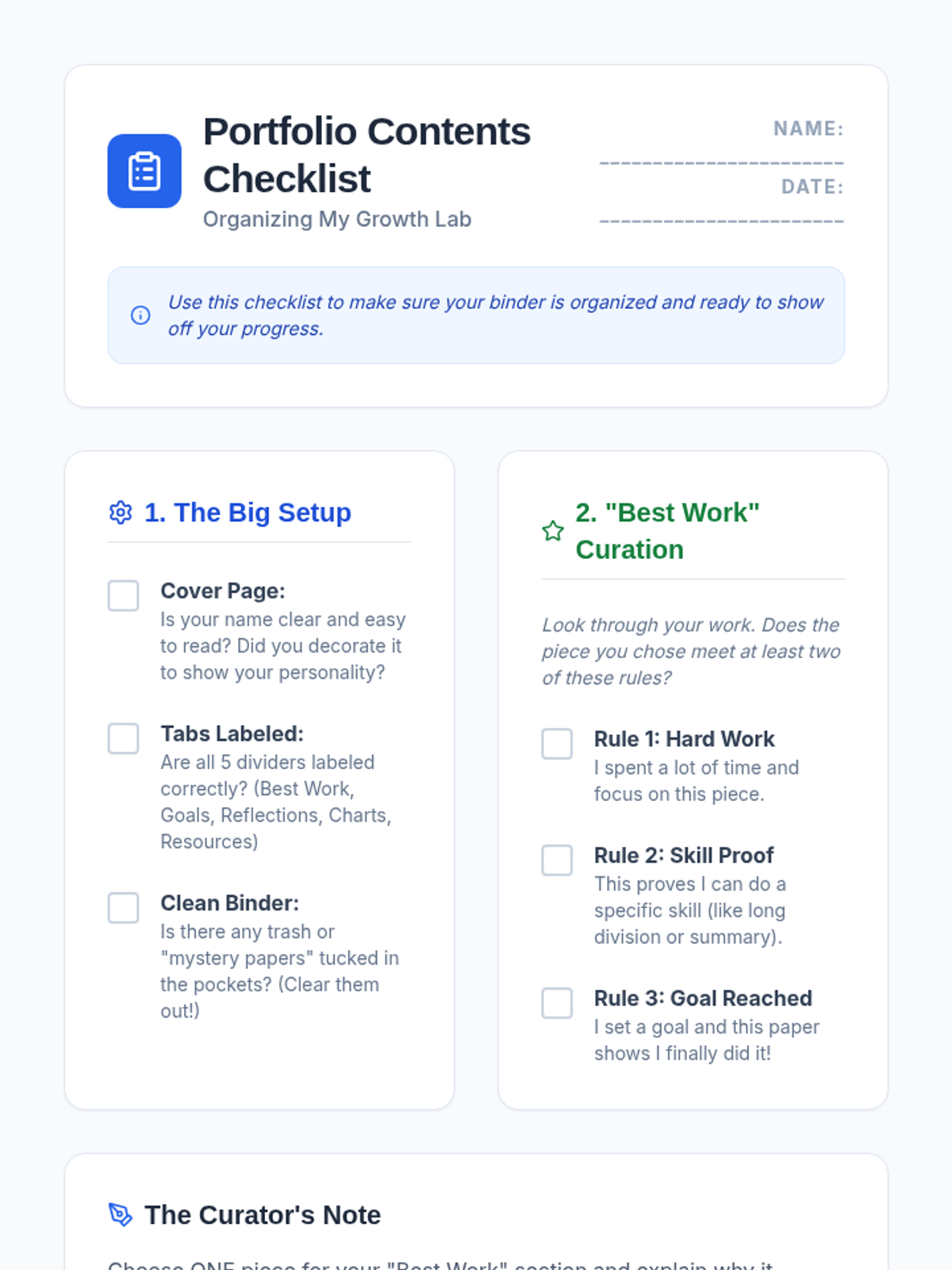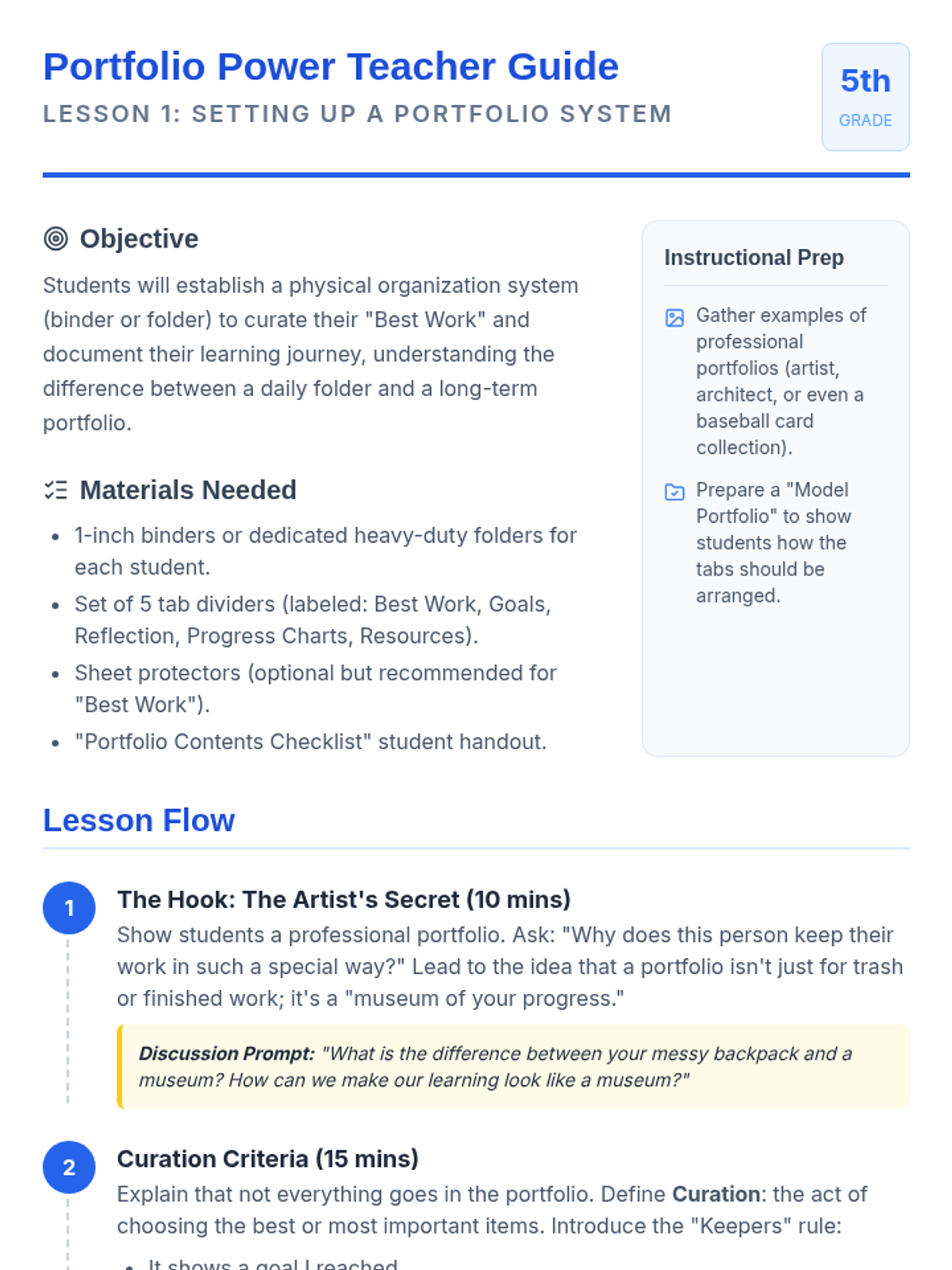 This sequence teaches 5th-grade students how to organize their school 'data'—assignments, goals, and grades—to take active ownership of their learning. Students move from passive learners to organized achievers by building portfolios, tracking tasks, and visualizing their growth.