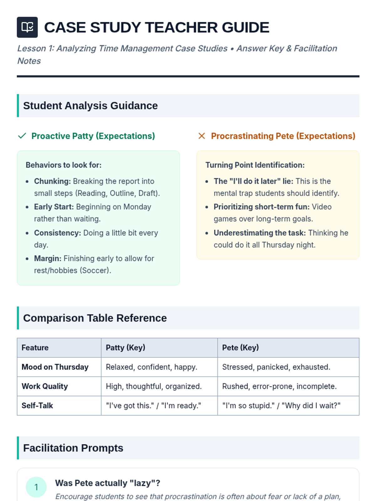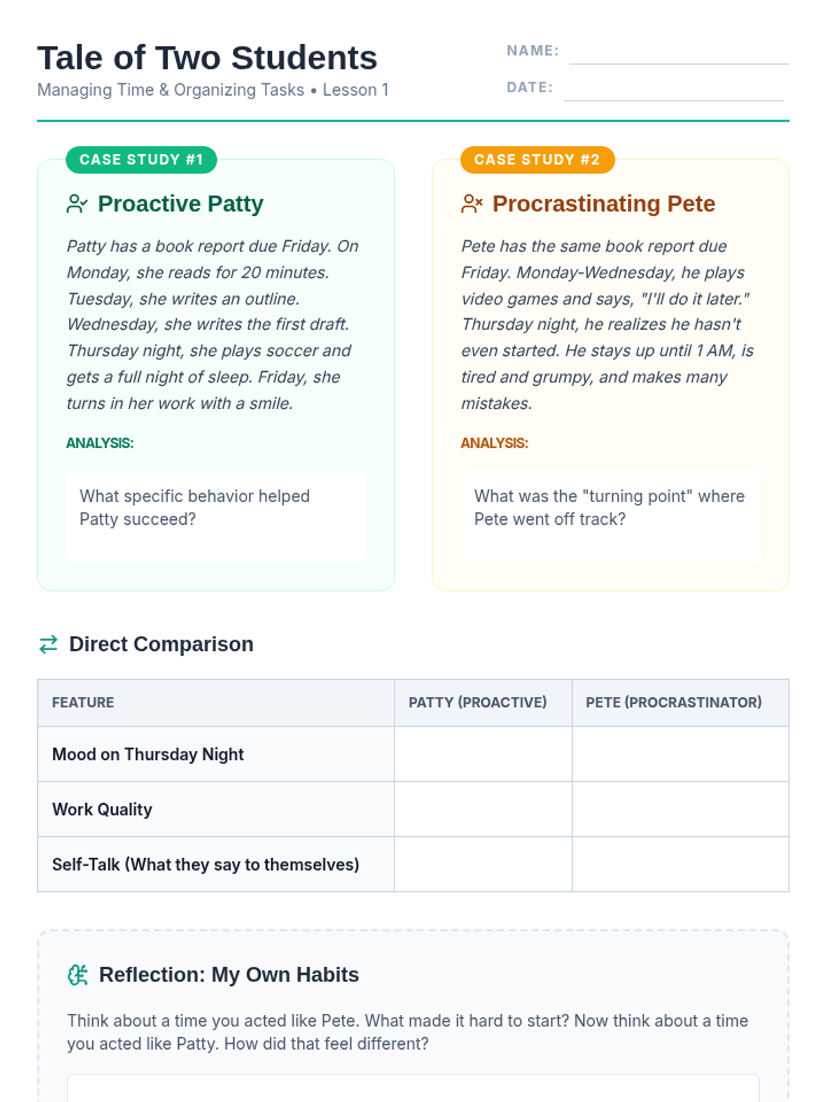 A comprehensive sequence for 5th-grade students focusing on executive function skills, time management, and task organization. Students move from analyzing case studies to creating their own actionable weekly schedules.