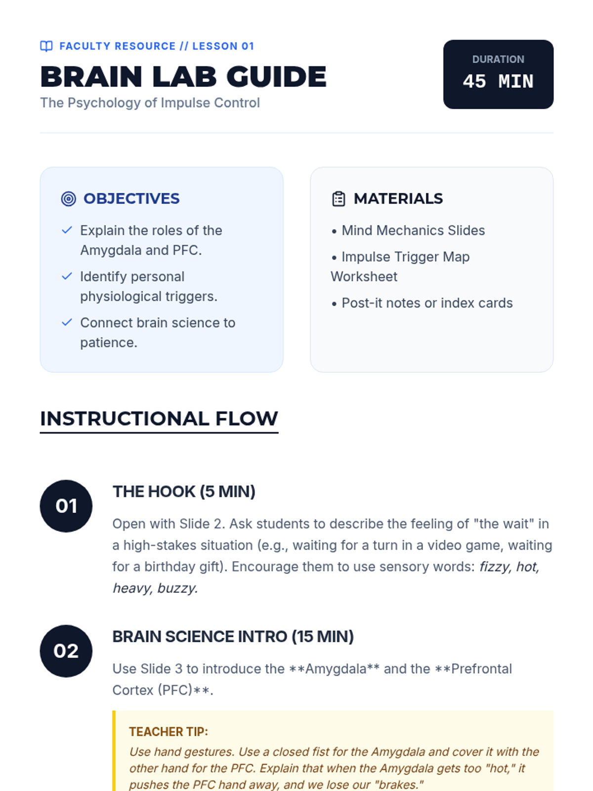 A 4-week social skills unit (8 lessons) teaching students to distinguish between their emotional brain and smart brain, focusing on regulation strategies, autism-specific challenges, and positive outlets.