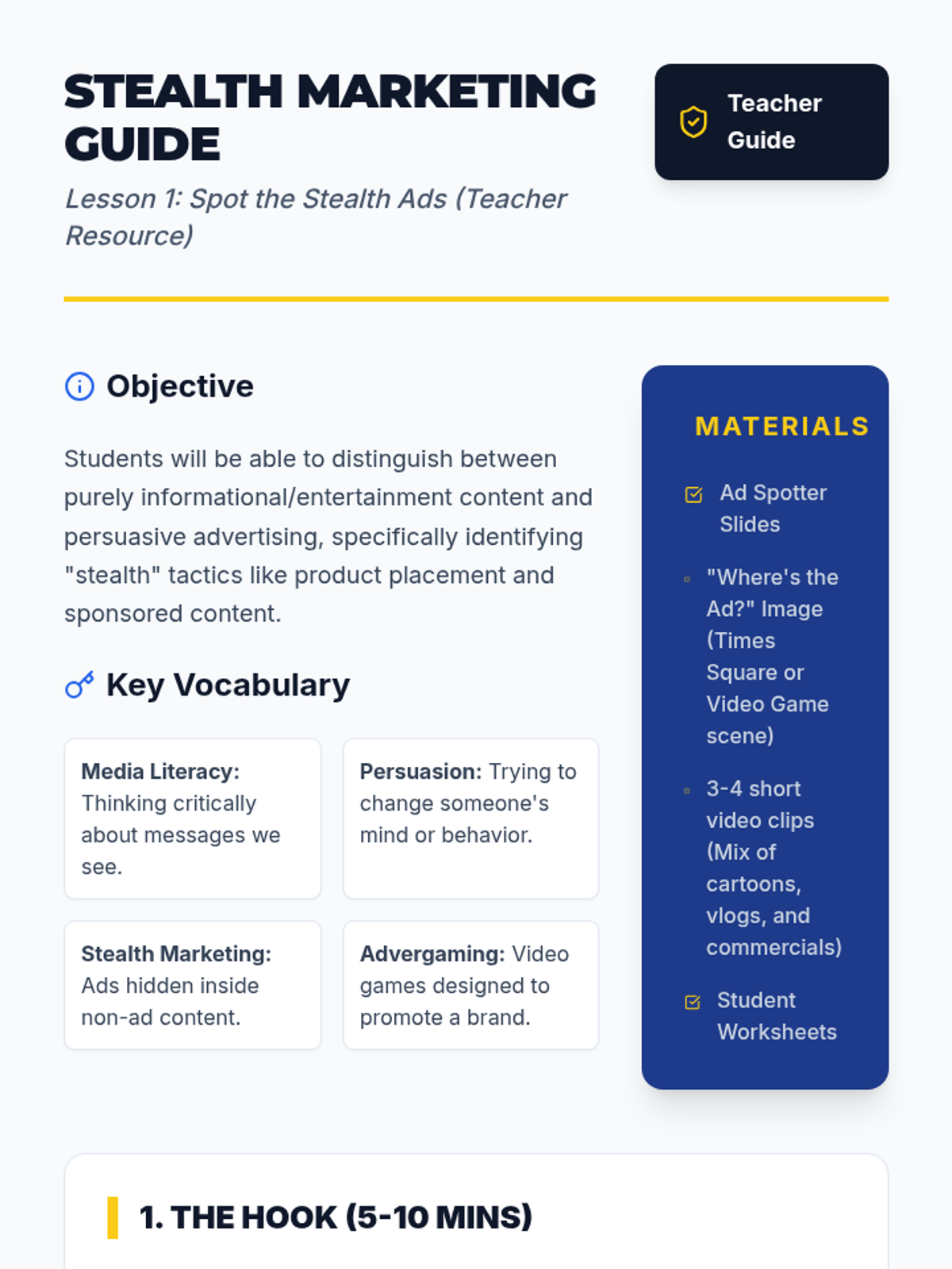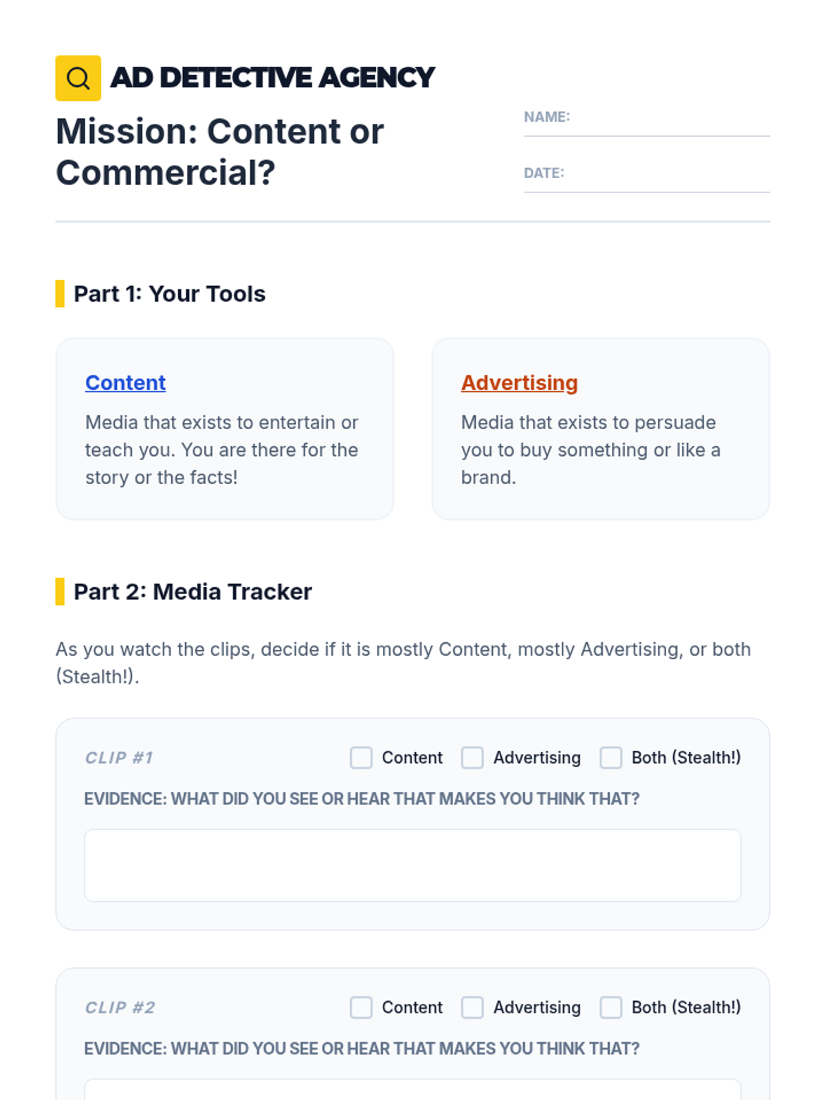 This 5th-grade sequence transforms students into media detectives who can identify, analyze, and deconstruct advertising messages across various platforms. Students progress from distinguishing between content and marketing to identifying specific psychological techniques, understanding target demographics, and recognizing digital scams, culminating in a creative project where they redesign advertisements to be 'strictly truthful'.