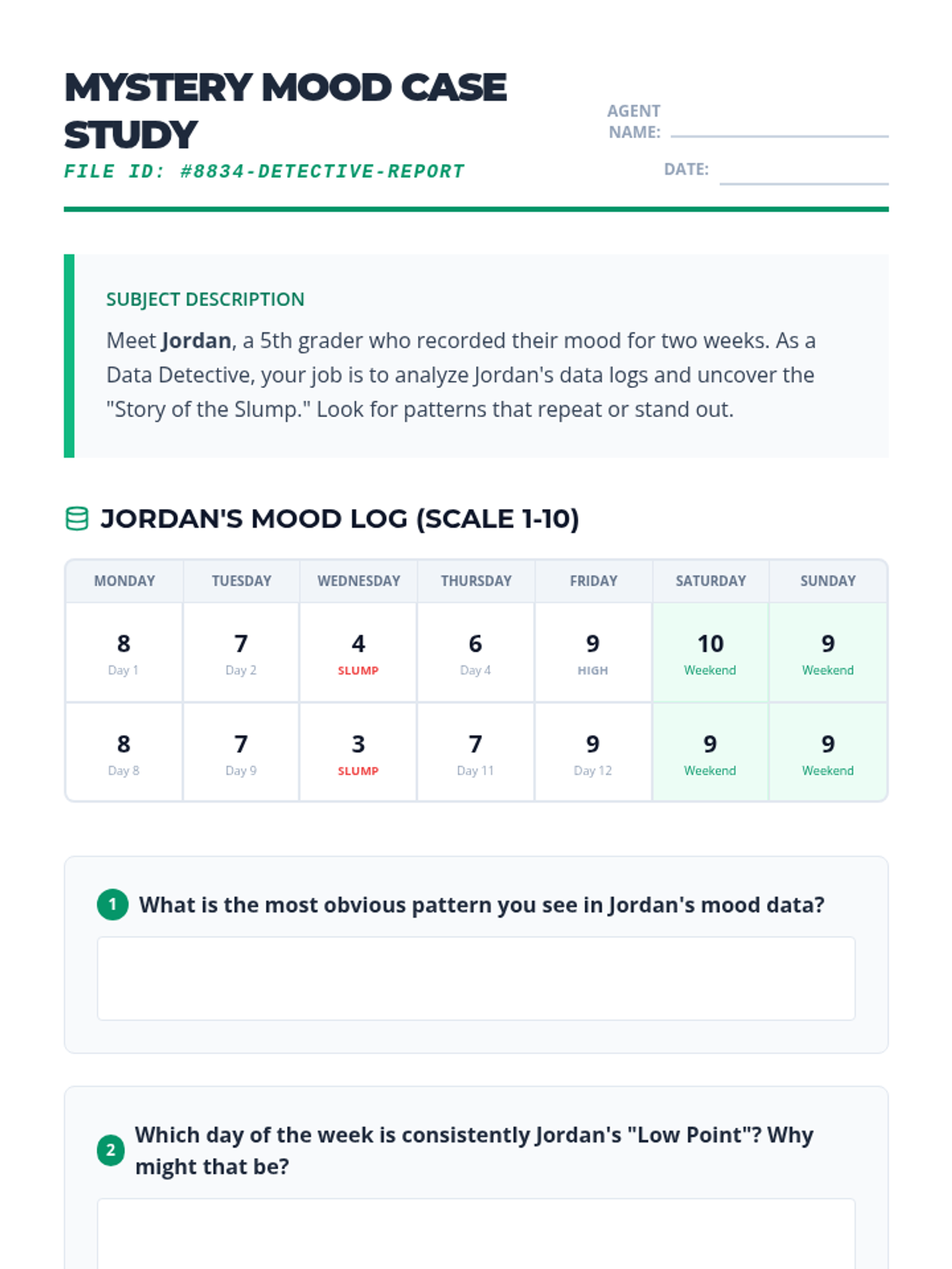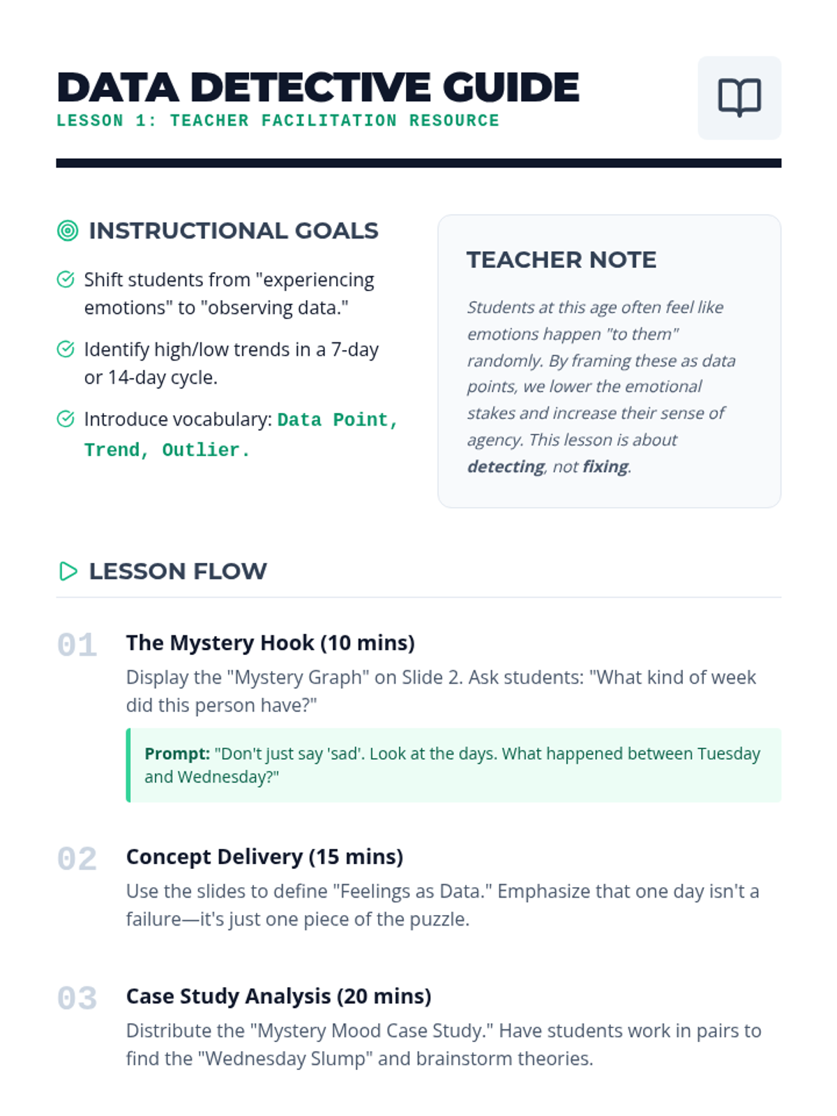A 5th-grade inquiry-based sequence that teaches students to analyze their daily check-in responses as data. Students learn to identify trends, correlate triggers, and develop proactive self-regulation strategies based on longitudinal behavioral patterns.