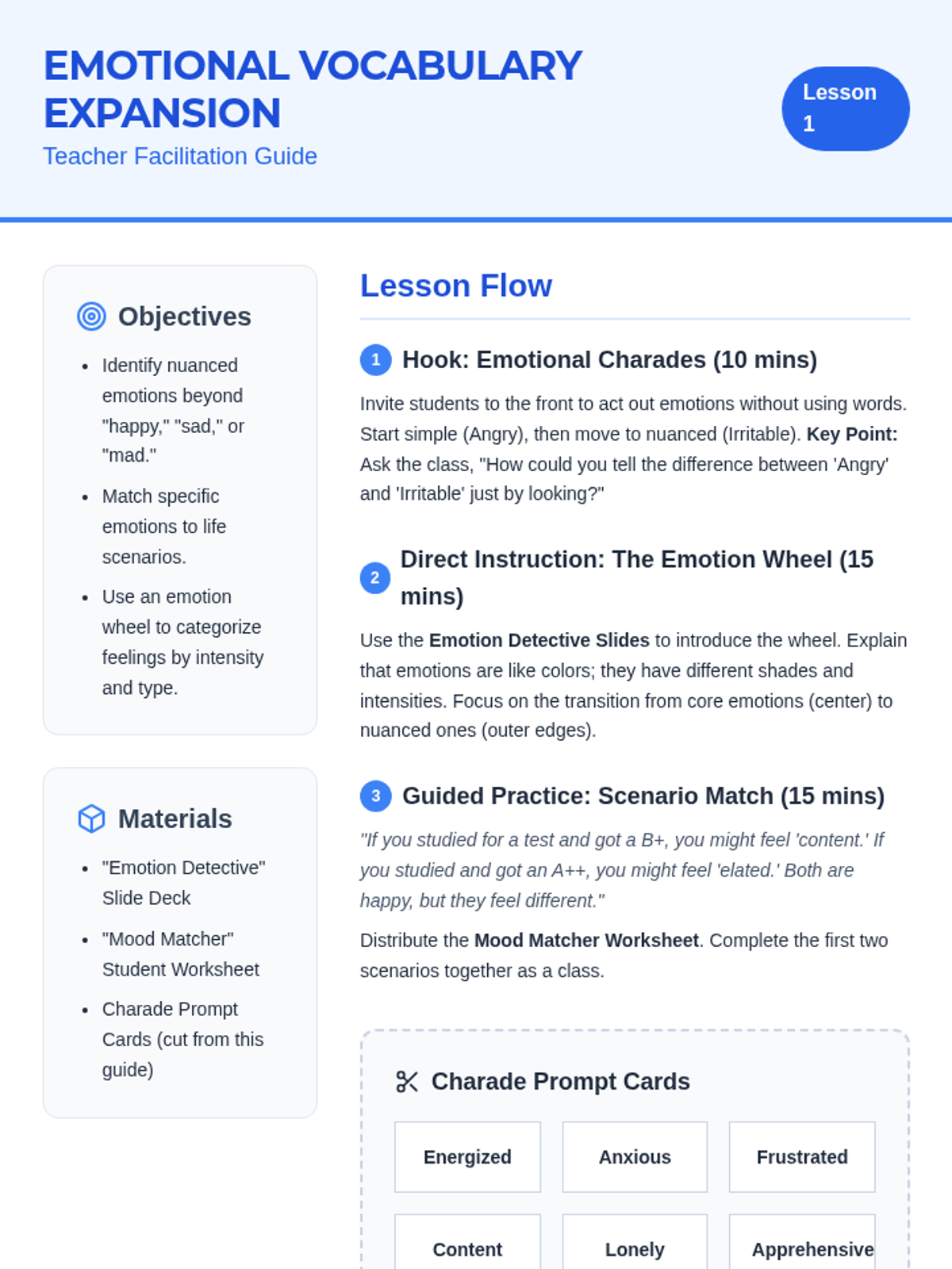 A multi-day social-emotional learning sequence that teaches students how to identify, manage, and communicate difficult emotions like anger and conflict using the metaphor of an 'Emotional Backpack'. Designed with high-visual support for EAL and neurodivergent learners.