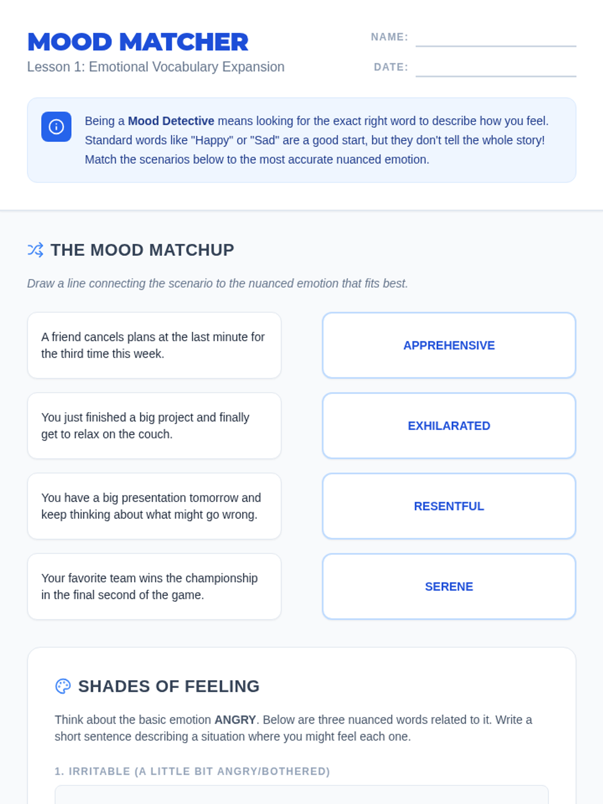 A 5th-grade sequence focused on teaching students how to monitor their emotional well-being using data and vocabulary. Students move from identifying nuanced emotions to tracking their moods and habits, ultimately learning to identify patterns and make healthy lifestyle adjustments.