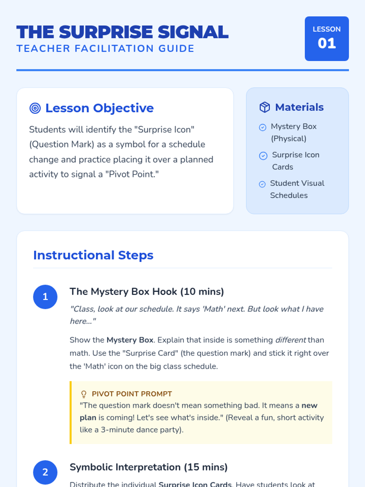 This sequence teaches 4th-grade students cognitive flexibility by introducing the 'Surprise Icon' and teaching coping strategies for schedule changes. Students move from identifying change indicators to practicing emotional regulation and simulated schedule interruptions, culminating in a celebration of their 'Super Flex' skills.