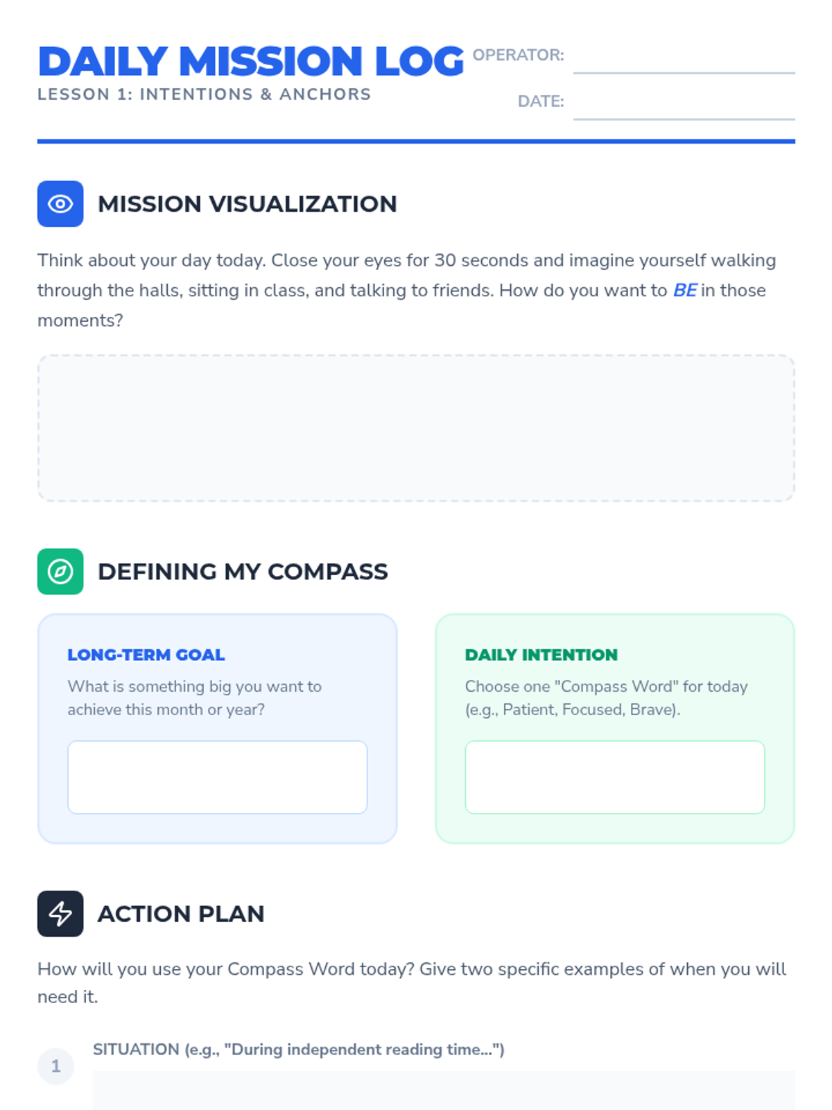 A 5-lesson sequence for 5th graders focused on linking emotional check-ins to daily goal setting and behavior management. Students learn to set intentions, align goals with energy levels, and reflect on their progress using the SMART framework and proactive obstacle planning.
