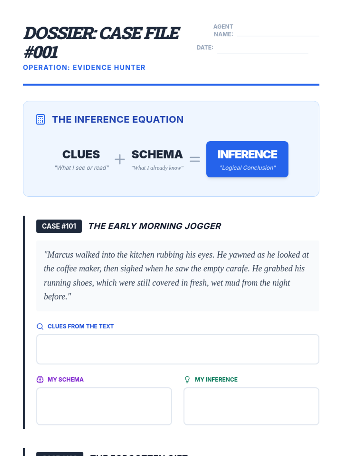 A forensic-themed reading comprehension unit where students act as investigators to master predictions and inferences. Through case studies and evidence tracking, students learn to bridge literal text with deep narrative meaning.